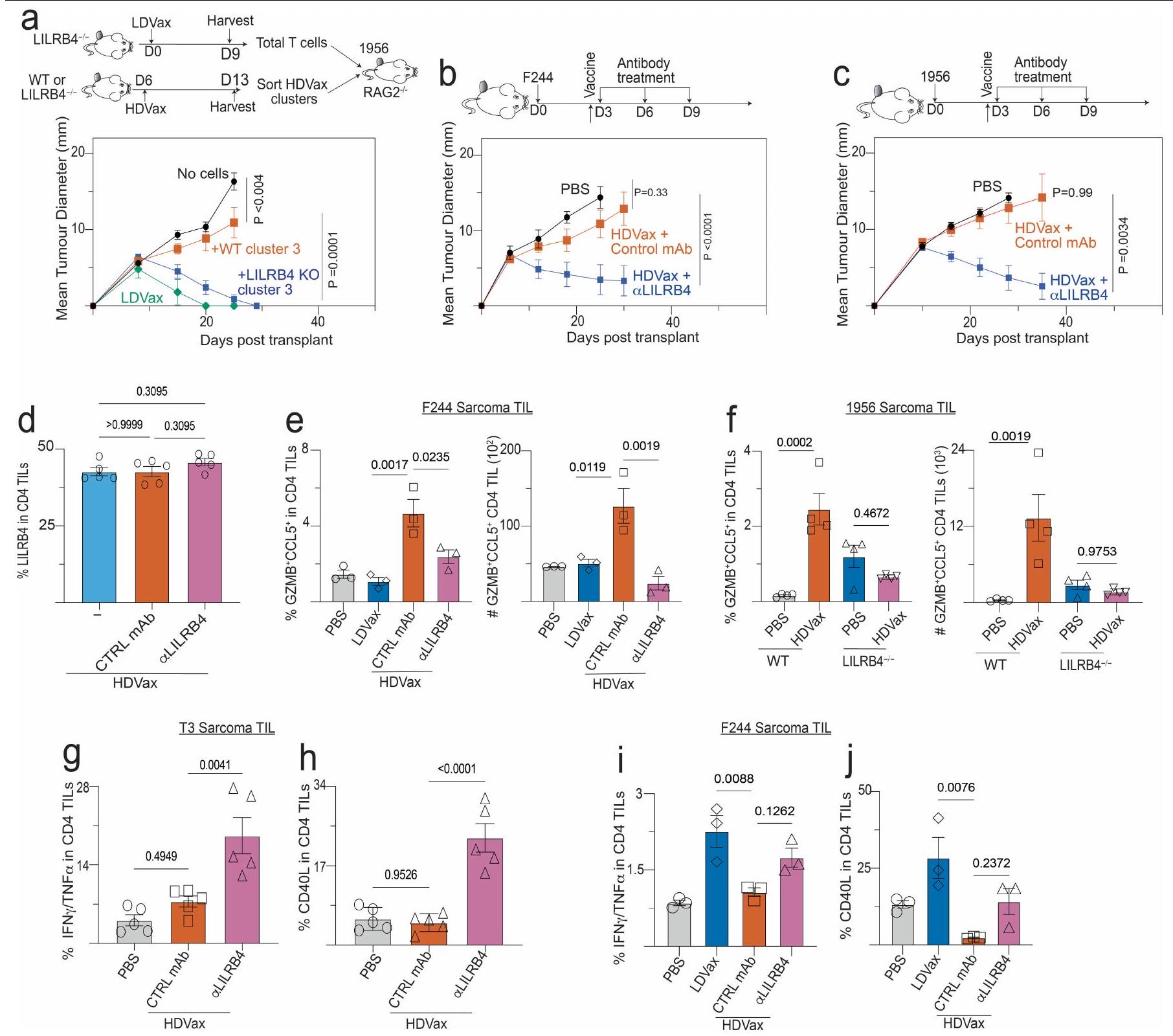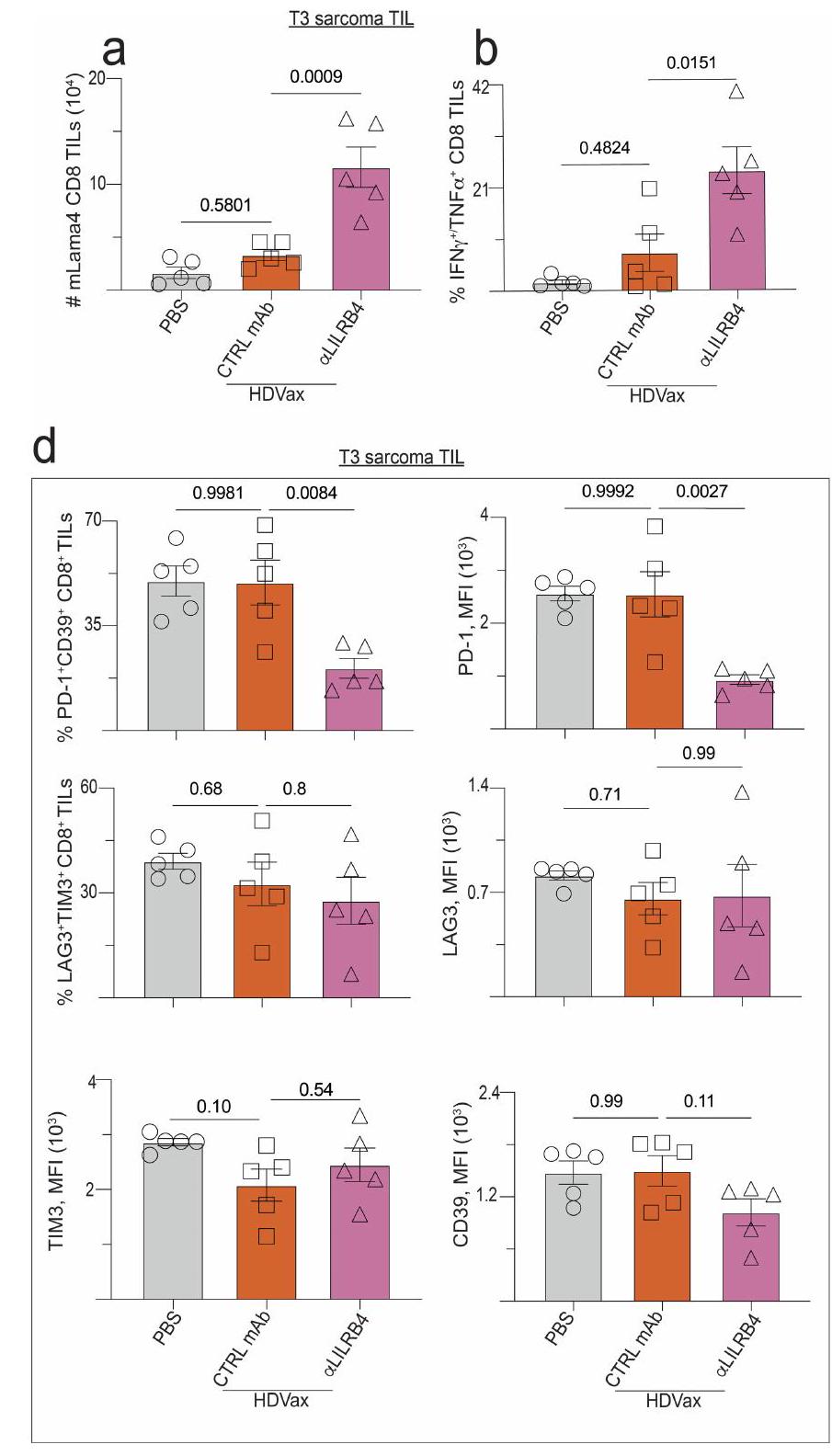 بينما أسست هذه النتائج علامات سطحية حددت الخلايا المثبطة، تساءلنا عما إذا كانت موجودة في الأورام المتزايدة بشكل تدريجي التي أصبحت غير حساسة لمضاد PD1. في الواقع، زادت نسبة TILs FOXP3_LILRB4 + في الأورام T3 المتزايدة بشكل تدريجي وغير المعالجة (الشكل 3g، h)، وارتبط ظهورها ببدء المقاومة لمضاد PD1 (الشكل 3i). زيادات مماثلة فيلم يتم ملاحظة الخلايا تحت هذه الظروف. تكشف هذه النتائج، جنبًا إلى جنب مع بيانات تسلسل RNA أحادي الخلية، أن تعبير LILRB4 يحدد غير-CD4 المثبط للخلاياسكان خلايا T التي تحفزها HDVax والتي تتطور أيضًا في الأورام المتزايدة بشكل تدريجي غير المعالجة حيث تتطور مقاومة للعلاج المناعي.
