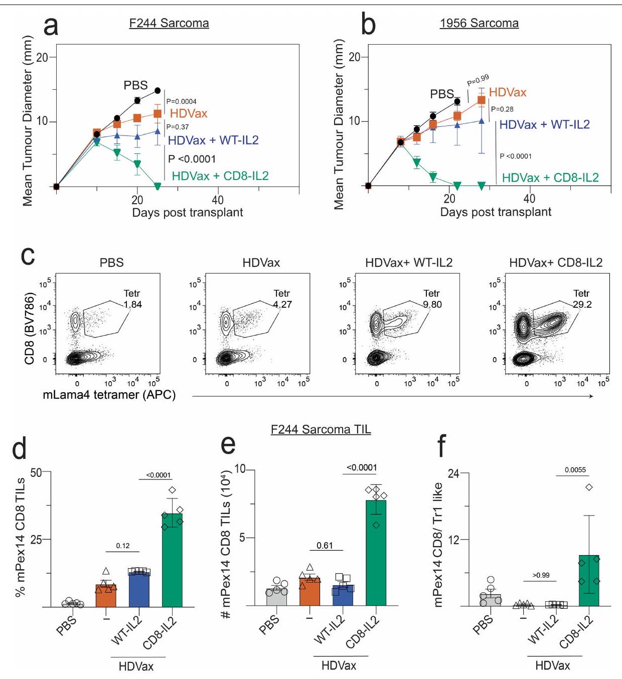 كان علاج CD8-IL-2 مرتبطًا بزيادات كبيرة في نسبةتحويل TILs إلى خلايا شبيهة بـ Tr1 (الشكل 4k). تم ملاحظة نتائج مماثلة أيضًا في نموذج ورم F244 (الشكل التمديدي 8d-f). وبالتالي، استهداف ميوتيني IL-2 إلىتتجاوز خلايا T تثبيط HDVax من خلال زيادة تكرار السيتوتوكسية المحددة بمستضد.الخلايا، مما يؤدي إلى تراجع الورم.