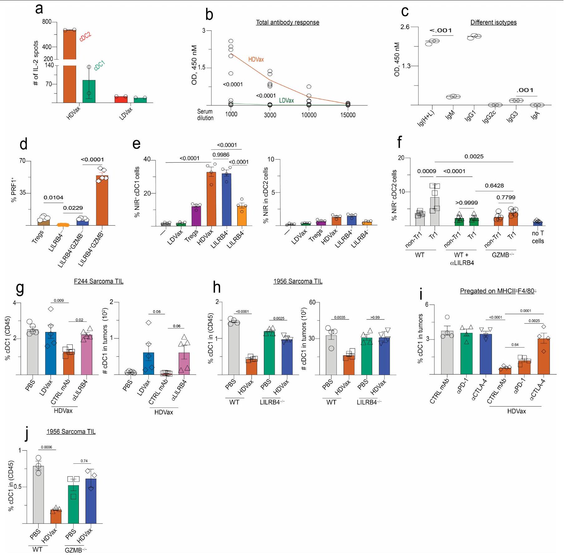 نظرنا في إمكانية أن تعكس النتائج المختلفة بين HDVax و LDVax اختلافات في خلايا تقديم المستضد (APCs) التي تقدم المItgb1 neoAg. استكشفنا هذه الإمكانية من خلال تطعيم الفئران السليمة إما بـ T3-LDVax أو T3-HDVax، وعزل مجموعات مختلفة من خلايا APC في نقاط زمنية مختلفة واختبار قدرتها على تقديم mItgb1 إلى هجين خلايا T محددة بـ mItgb1باستخدام T3-LDVax، لاحظنا أن كل من cDC1s و cDC2s قدمت النيوبيبتيد mItgb1 إلى نفس الدرجة تقريبًا (الشكل 9a من البيانات الموسعة). بالمقابل، باستخدام T3-HDVax، برزت مجموعة cDC2 كأهم خلايا تقديم المستضد (الشكل 5a). يتماشى هذا مع النتيجة، حيث أن HDVax وليس LDVax أثار استجابات قوية للأجسام المضادة تجاه ببتيد mItgb1 (الشكل 9b،c من البيانات الموسعة). كما هو متوقع، فإن خلايا Tr1 المستحثة بواسطة HDVax عبرت عن مستويات عالية من GZMB و perforin (الشكل 3c والشكل 9d من البيانات الموسعة)، مما يشير إلى أنها قد تظهر على الأقل بعض وظائفها المثبطة من خلال قتل خلايا تقديم المستضد التي تعبر عن MHC-II.نظرًا لأن خلايا T3 لا تعبر أبدًا عن MHC-II، فقد اعتبرنا إمكانية أن تكون الخلايا المستهدفة لـ Tr1 السامة هي cDC1 لأنها تقدم كل من مستضدات الورم MHC-I وMHC-II.لذلك، فهي بشكل خاص مهم للاستجابة المضادة للأورام. أظهرت اختبارات القتل في المختبر أن خلايا Tr1 المستحثة بواسطة T3-HDVax ولكن ليس خلايا CD4 غير Tr1قتلت خلايا T خلايا cDC1 المحملة بـ mltgb1 ولكنها لم تقتل خلايا cDC2 بطريقة تعتمد على GZMB (الشكل 5b والشكل الإضافي 9e، f). من الجدير بالذكر أن خلايا Tr1 التي تم جمعها من الفئران المعالجة بـ T3-HDVax في وجود مضاد LILRB4 أظهرت نشاط قتل في المختبر منخفض. بالإضافة إلى ذلك، تم تقليل تردد وعدد خلايا cDC1 المستعادة من الفئران الحاملة للأورام المعالجة بـ T3-HDVax بمقدار 4.5 مرة مقارنة بالفئران المعالجة بـ T3-LDVax أو PBS. تم استعادة استعادة CDC1 جزئيًا عندما تم دمج T3-HDVax مع علاج مضاد LILRB4 (الشكل 5c، d والشكل الإضافي 9g) أو عندما تم إعطاء HDVax لـ Lilrb4.الفئران (الشكل 9h من البيانات الموسعة). وبالمثل، فإن العلاج بمضاد CTLA4، الذي يستنفد خلايا Tr1 والخلايا (الشكل الإضافي 3j)، استعادة تعافي cDC1s في فئران T3-HDVax (الشكل الإضافي 9i). لم يُلاحظ أي انخفاض في استعادة cDC1 في الفئران المعالجة بـ T3-HDVax Gzmb.الفئران (الشكل 9j من البيانات الموسعة). وبالتالي، فإن اللقاحات التي تحتوي على جرعات عالية من neoAg MHC-II تفضل تقديم المستضد بشكل أساسي بواسطة cDC2s، مما يؤدي إلى تكوين خلايا Tr1 السامة التي تقتل cDC1s التي تقدم مستضدات الأورام بطريقة تعتمد على GZMB.