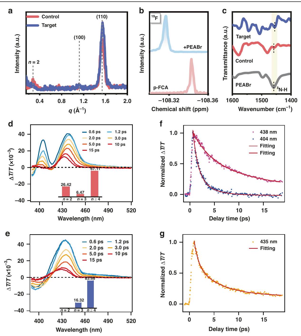 تم العثور على أن إعادة بناء الطور تؤثر بشكل كبير على ديناميات الحامل، كما كشفت طيفية الامتصاص العابر (TA). تقدم الشكل S20a و b (المعلومات الداعمة) خرائط الألوان TA لعينات isCl-0 و isCl-3. يتم تصوير طيف TA المقابل في أوقات تأخير مختلفة في الشكل 4d و e. بالنسبة لعينة isCl-0، تظهر قمم تلاشي الحالة الأساسية (GSB) المميزة في