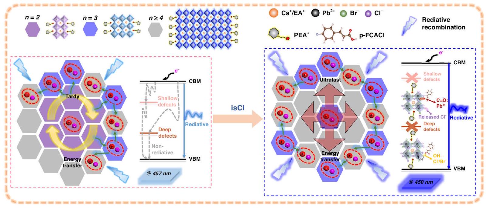 depicted in Fig. 5. During isCl treatment, released chloride ions renovate halide vacancies both in bulk and on the surface of RDPs, which facilitates enlarged bandgap and blue-shifted emission. Meanwhile, the