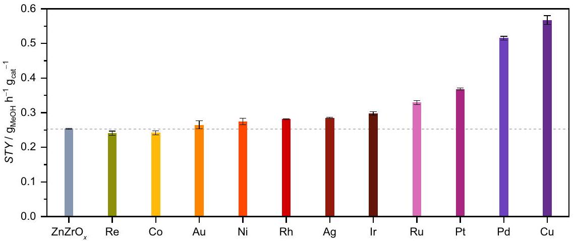 methanol . Accordingly, the optimal zinc content ( ) reported was selected for this study, whereas a nominal amount of was chosen for all metal promoters ( , and Cu ), to produce catalysts with similar composition and thus enable a direct comparison of their promotional effects on . Both experimental compositions closely matched nominal values, as determined by inductively coupled plasma optical emission spectroscopy (ICP-OES, Supplementary Table 2). Performance evaluation at relevant hydrogenation to methanol conditions ( , and ) showed that, for most systems, methanol space-time yield (STY) remains virtually unchanged ( Re – and ), slightly increased (ca. , and ), or moderately improved (ca. , Ru- and ) in comparison to unpromoted ( , Fig. 1). This trend in methanol productivity can be traced back to the specific trade-off between conversion ( ) and methanol selectivity ( ) displayed by these catalysts, with Ru- and Pt-ZnZrO attaining higher (ca. ) without experiencing significant loss in (Supplementary Fig. 1). Remarkably, Cu exerts the highest improvement in the methanol STY (ca. 120%, STY= , Fig. 1), which surpasses that induced by Pd, the current state-of-the-art promoter for . The striking methanol productivity of is linked to its ability to sustain an outstanding (ca. ) at high levels (ca. Supplementary Fig. 1), a similar behavior also observed for . Interestingly, unpromoted and catalysts show very similar specific surface area ( ) in fresh form (ca. , Supplementary Table 3 and Supplementary Fig. 2) which remains virtually unaltered after 20 h equilibration on stream. This indicates that these systems are particularly stable under reaction conditions and their performance difference does not stem from differences in . In addition, this highlights the advantages of using FSP, as it allows the reproducible synthesis of catalysts of varying compositions that can be used and compared without any pre-treatment (washing or calcination) and having to change the manufacturing procedure.