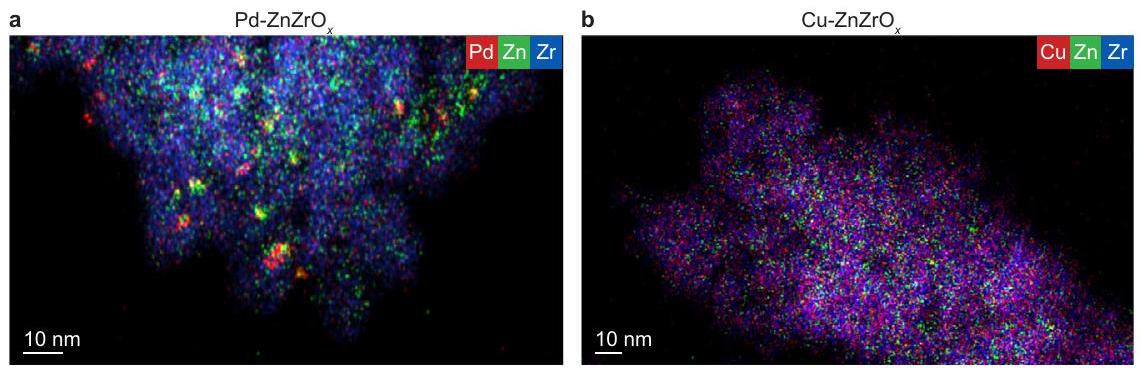 indicating that CO formation is inhibited over at the applied hydrogenation conditions, rationalizing its high methanol selectivity. These findings are in line with copper agglomerating into nanoparticles in upon reaction, which is known to favor CO formation and, although not detected by XRD (Supplementary Fig. 13), it is clearly evidenced by STEM-EDX (Supplementary Fig. 14a). In contrast, copper remains well dispersed as low-nuclearity species in (Supplementary Fig. 14b), as copper atoms are most likely associated with zinc, indicating that this speciation favors methanol formation over CO production.