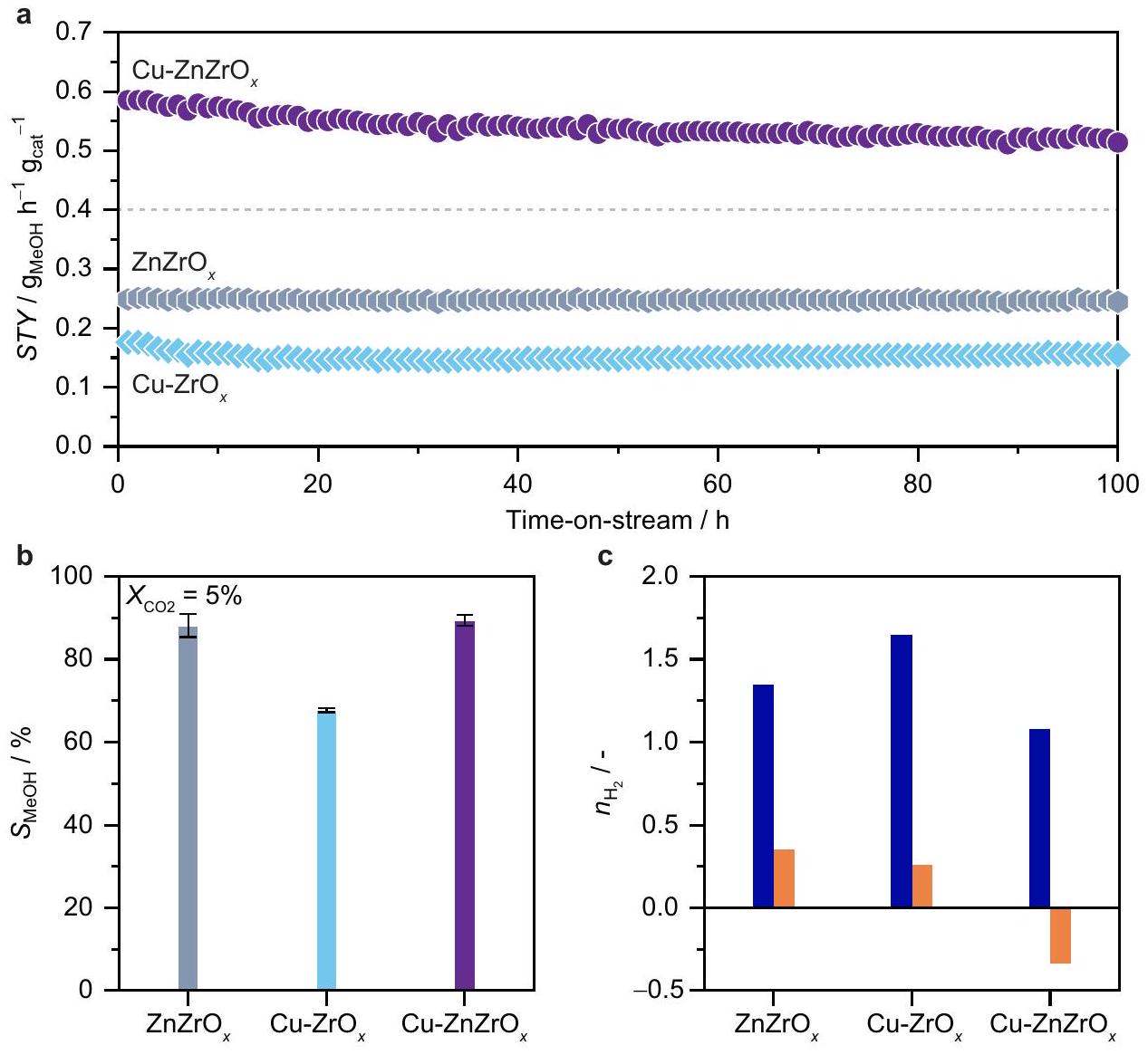 To gain deeper insights into the origin of copper promotion in , and corresponding reference and materials prepared by FSP were further investigated (Fig. 3a and Supplementary Fig. 11,12). Catalyst durability assessed in a 100 -h test (Fig. 3a) confirms that shows a significantly higher methanol productivity, which stabilizes after 50 h induction time ( ca. 0.55 ) compared to that of and combined, indicating that its performance does not result from a simple additive effect of integrating both binary systems. The induction period observed for the catalyst relates to the restructuring and equilibration of the catalyst at elevated temperature and pressure. A similar behavior is observed for the catalyst, albeit requiring a shorter time (ca. 20 h ), likely due to the less complex architecture of this catalyst. It is important to note that beyond the induction period, demonstrates stable performance, greatly surpassing that of the and systems. The improved methanol STY of compared to and is linked to its higher (ca. 9 versus 4 and , respectively) and, in the case of , also (ca. 90 versus ), as evidenced by evaluation carried out at similar levels (ca. 5%, Fig. 3b). For completeness, Cu was also synthesized and its performance evaluated (Supplementary Fig. 11), which is comparable to but notably inferior to , further highlighting the superior catalytic properties of the ternary system. Interestingly, while all catalysts exhibit a low apparent reaction order with respect to for methanol synthesis (Fig. 3c), displays a negative for the RWGS reaction,