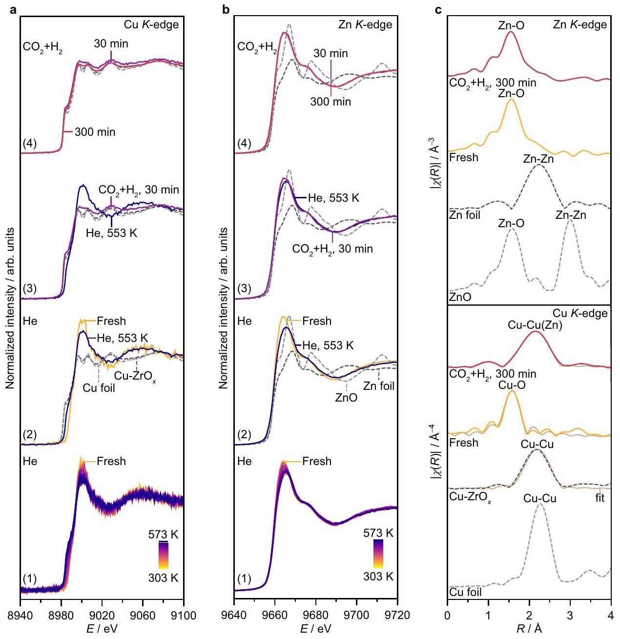 تم إجراء مطيافية الانبعاث الضوئي للبلازما المقترنة بالحث (ICP-OES) باستخدام جهاز هوريبا ألترا 2 المزود بكاشف أنبوب الفوتومولتيبلاير. تم هضم العينات بمساعدة إشعاع الميكروويف باستخدام خليط من HCl (ألفا أيسار، ) ، (ألفا أيسر، )، و HF (سيغما ألدريتش، ) بنسبة حجم 2:1:0.5، تليها المعادلة باستخدام محلول مشبع من (فلوكا، ). تم إجراء امتصاص النيتروجين عند 77 كلفن باستخدام محلل Micromeritics TriStar II. قبل القياسات، تم إزالة الغازات من العينات عند 473 كلفن تحت فراغ لمدة 12 ساعة. المساحة السطحية المحددة ( تم تحديده باستخدام طريقة بروناور-إيميت-تيلر (BET). تم إجراء تحليل حيود الأشعة السينية (XRD) باستخدام جهاز حيود ريغاكوا سمارت لاب مع كاشف D/teX Ultra 250 باستخدام إشعاع Cu Ka. ) وتعمل في هندسة براج-برينتانو. تم الحصول على البيانات في نطاق بخطوة زاوية قدرهاوزمن العد 1.5 ثانية لكل خطوة. الاختزال المبرمج حرارياً بالهيدروجين (-TPR) تم قياسها عند الضغط الجوي باستخدام محلل Micromeritics AutoChem HP II. تم قياس تيار المخرج للجهاز باستخدام كاشف الموصلية الحرارية. تم إجراء تصوير الميكروسكوب الإلكتروني الناقل ذو المجال المظلم عالي الزاوية (HAADF-STEM) وتحليل الطيف بالأشعة السينية المشتتة للطاقة (EDX) على جهاز Talos F200X المزود بنظام Super-X EDS وتصوير STEM عالي الدقة على جهاز HD2700CS (Hitachi) المصحح للبروبة، وكلاهما يعمل عند 200 كيلوفولت. تم تفريق مسحوق المحفز في الإيثانول، وطحنه في هاون، وتفريقه على شبكة STEM من النحاس أو النيكل مغطاة بفيلم دعم من الكربون الشبكي. بعد تبخر الإيثانول في درجة حرارة الغرفة، تم تثبيت العينة على حامل مائل واحد وإدخالها في الميكروسكوب. تم أيضًا تحليل عينات مختارة بواسطة HAADF-STEM-EDX باستخدام Titan Themis المصحح للبروبة والذي يعمل عند 300 كيلوفولت. تم إجراء تجارب مطيافية امتصاص الأشعة السينية (XAS) في خطوط الأشعة السويسرية النرويجية (SNBL، BM31) في منشأة الإشعاع السنكروتروني الأوروبية (ESRF).تم تحديد شعاع الأشعة السينية باستخدام مقياس الطيف أحادي البلورة المزدوج المبرد بالنيتروجين السائل Si(111)تم قياس رقائق النحاس والزنك المعدنية من أجل المعايرة المطلقة للطاقة، باستخدام– غرف تأين مملوءة لمستويات امتصاص مثالية. تم استخدام تكوين هندسة الفلورية للتحليل تحت ظروف التشغيل، باستخدام كاشف Si SDD عنصر واحد مع تبريد بيلتير. تم إجراء مسح مستمر لكل من حواف Cu (بين 8880 و 9550 eV) و Zn (بين 9550 و 10650 eV)، وتم تعيين حجم الخطوة إلى 0.5 eV، مع مدة مسح قدرها 150 ثانية. تم تعيين حجم الشعاع إلى (أفقيًاعمودياً). المحفز ( ) تم وضعه بين سدادتين من صوف الكوارتز في خلية مفاعل شعرية من الكوارتز (قطر خارجي 1 مم، سمك جدار 0.01 مم). تم إجراء تجارب XAS في الخطوات التالية: (i) التسخين إلى 573 كلفن في معدل التسخين ، ووقت الإقامة )، (ii) التحويل إلى ظروف الهدرجةوقت الإقامة )، (iii) الانتقال إلى معدل التسخين، ووقت الإقامة 30 دقيقة) و (iv) التبريد إلى درجة حرارة الغرفة فيمعدل التسخين، ووقت الإقامة تم إجراء قياسات هيكل الامتصاص الدقيق للأشعة السينية الممتدة (EXAFS) في كل حالة مستقرة، بما في ذلك العينة الجديدة والمستخدمة، بالإضافة إلى تحتظروف تفاعل الهدرجة. تحت جميع الظروف الأخرى، بما في ذلك تسخين درجة الحرارة (الخطوتان الأولى والرابعة) وبعد الانتقال إلى ظروف مختلفة (الخطوتان الثانية والرابعة، كما هو موضح أعلاه)، كانت قياسات هيكل الامتصاص القريب من الحافة بالأشعة السينية (XANES) مفضلة بدلاً من ذلك، لالتقاط التغيرات الديناميكية في الأنظمة. تم جرعات الغازات عالية النقاء بواسطة مجموعة من وحدات التحكم الرقمية في تدفق الكتلة من برونكهورست وتمت مراقبة النتيجة عبر الإنترنت من خلال مطياف الكتلة Pfeiffer Vacuum OmniStar GSD 320 O مع برنامج Quadera. تم معايرة الطيف الناتج للطاقة، وتصحيح الخلفية، وتطبيعها باستخدام برنامج Athena من مجموعة برامج Demeter.تم ملاءمة طيف EXAFS الموزون بشكل مثالي و -نوافذ (الجدول التكميلي 5) باستخدام برنامج أرتيميس. عامل تقليل السعة (تم تح