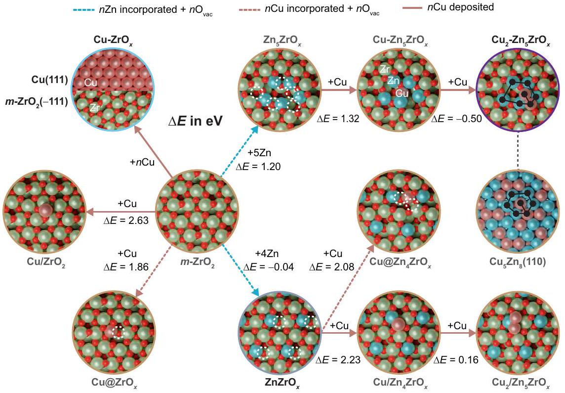 represent the incorporation of or Cu atoms (blue and light pink, respectively) accompanied with the formation of oxygen vacancies on the surface. Solid light pink lines denote the deposition of a Cu atom on and surfaces. The common pattern found in and is depicted in black. Color code of DFT models: Zn (blue), Zr (green), Cu (light pink), O (red), and O vacancies (doted white circles).