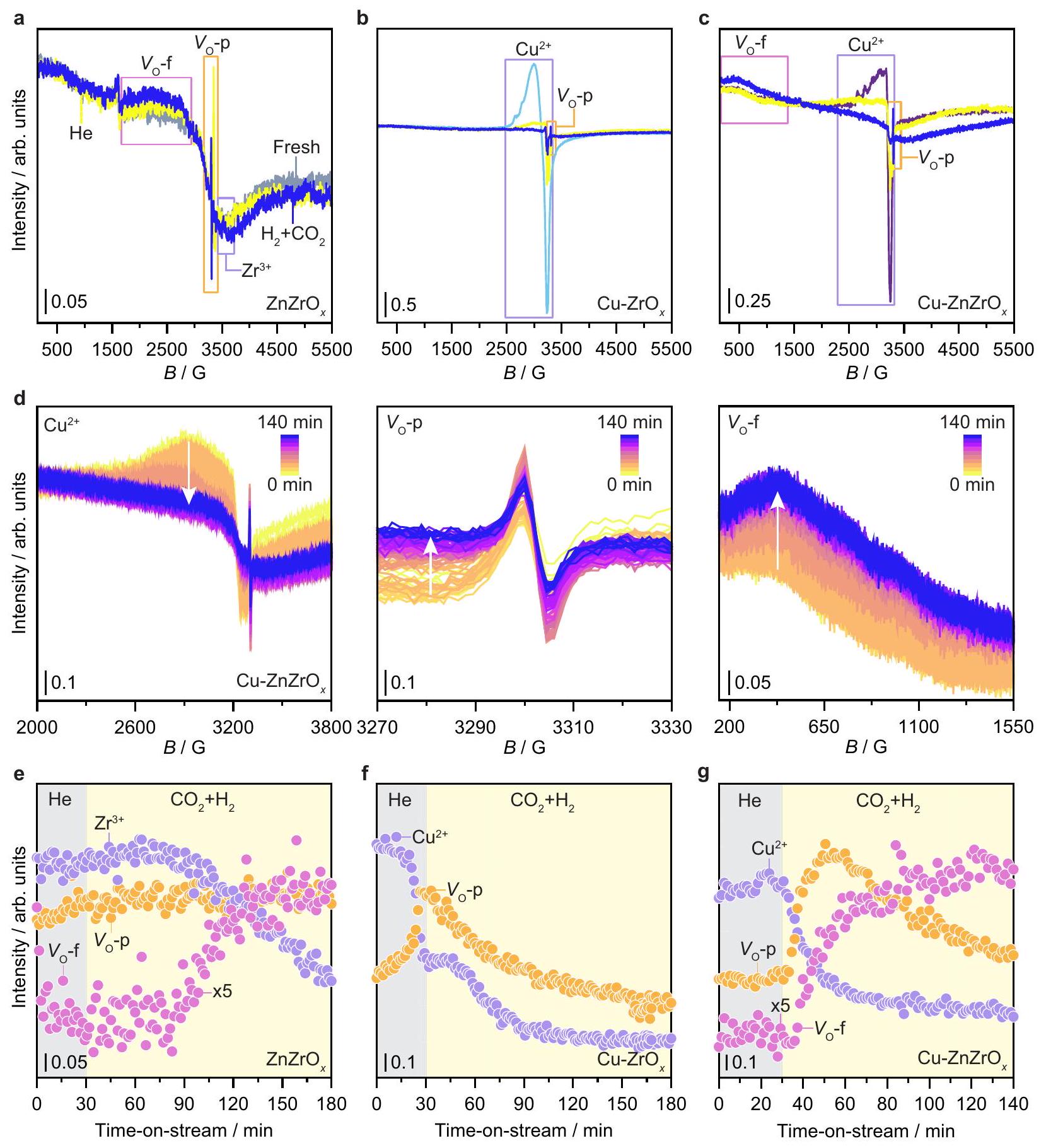 To gather additional insights into the dynamics of oxygen vacancies on catalyst, operando EPR measurements were performed under He and hydrogenation conditions ( 1 MPa and