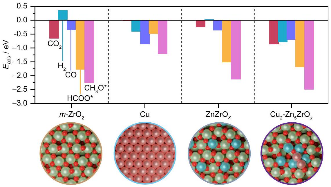 Fig. 7 | Adsorption energies of reactive species. Adsorption energies, of key reactive species on relevant surfaces representative of , and Cu catalytic systems. Color code of DFT models: Zn (blue), Zr (green), Cu (light