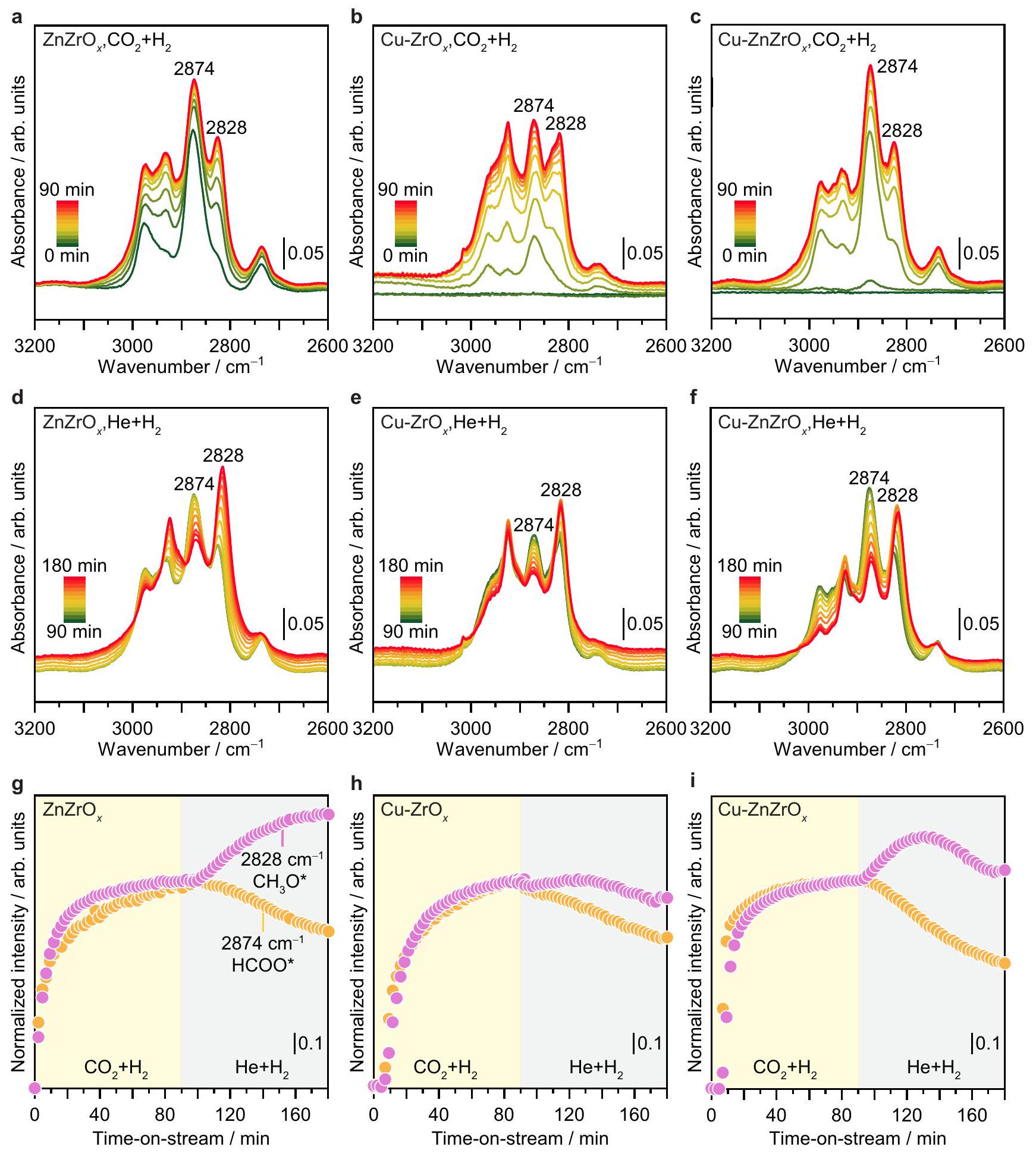 To gain experimental insights into key reactive intermediate species formed on , and catalysts under reaction conditions, operando diffuse reflectance infrared Fourier transform spectroscopy (DRIFTS) experiments were conducted (Fig. 8 and Supplementary Fig. 28). Upon exposure to the reaction mixture ( , and 573 K ; Fig. 8a-c, and Supplementary Fig. 28), all catalysts exhibited bands characteristic of formate ( , , and ) and methoxy species ( , 1140,2827 , and ), which can be assigned to distinct vibrational modes (Supplementary Table 6, 7) . These results demonstrate that methanol synthesis via hydrogenation over all catalysts follows the formate pathway, which is in line with previous studies on and indicates that the copper promotion in Cu is not governed by a different mechanism. Interestingly, a strong signal attributed to gas-phase (Supplementary Fig. 28) is detected for , which is in agreement with its tendency to promote this undesired product, thus explaining its lower