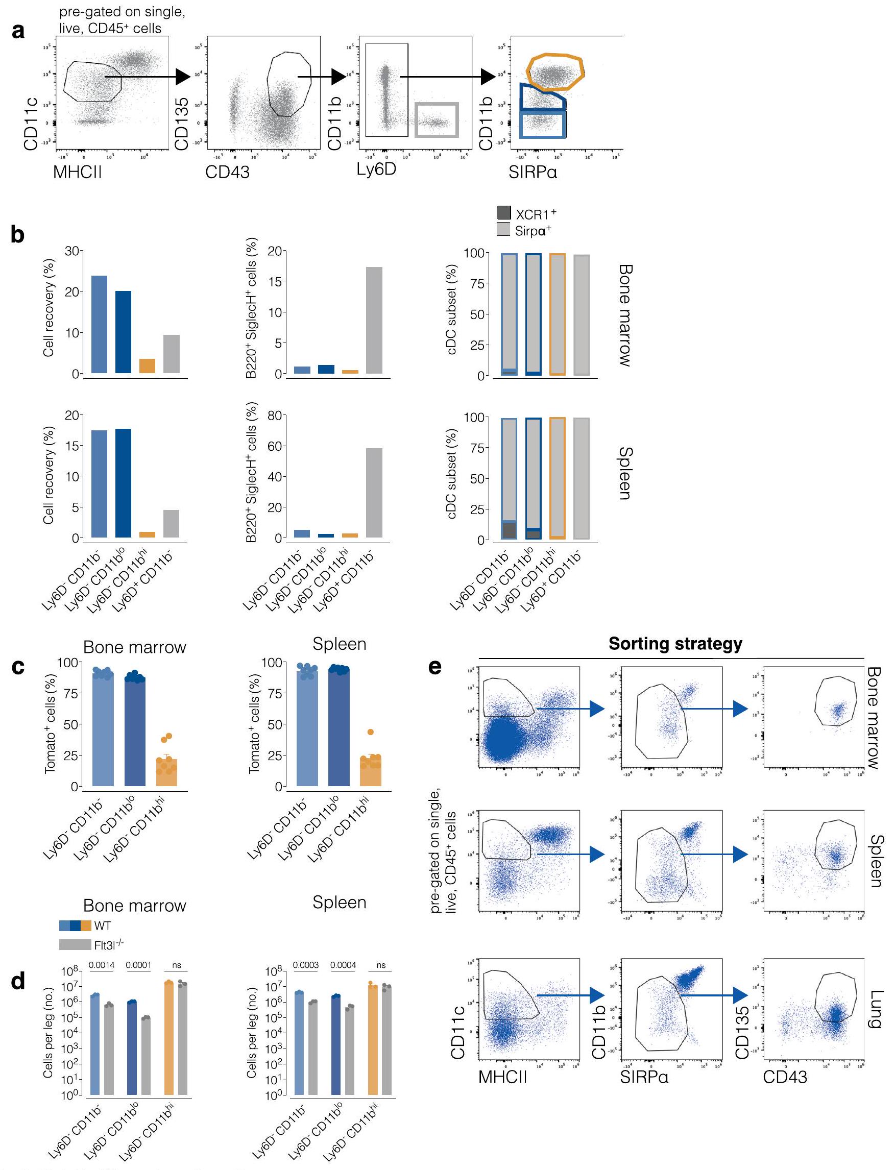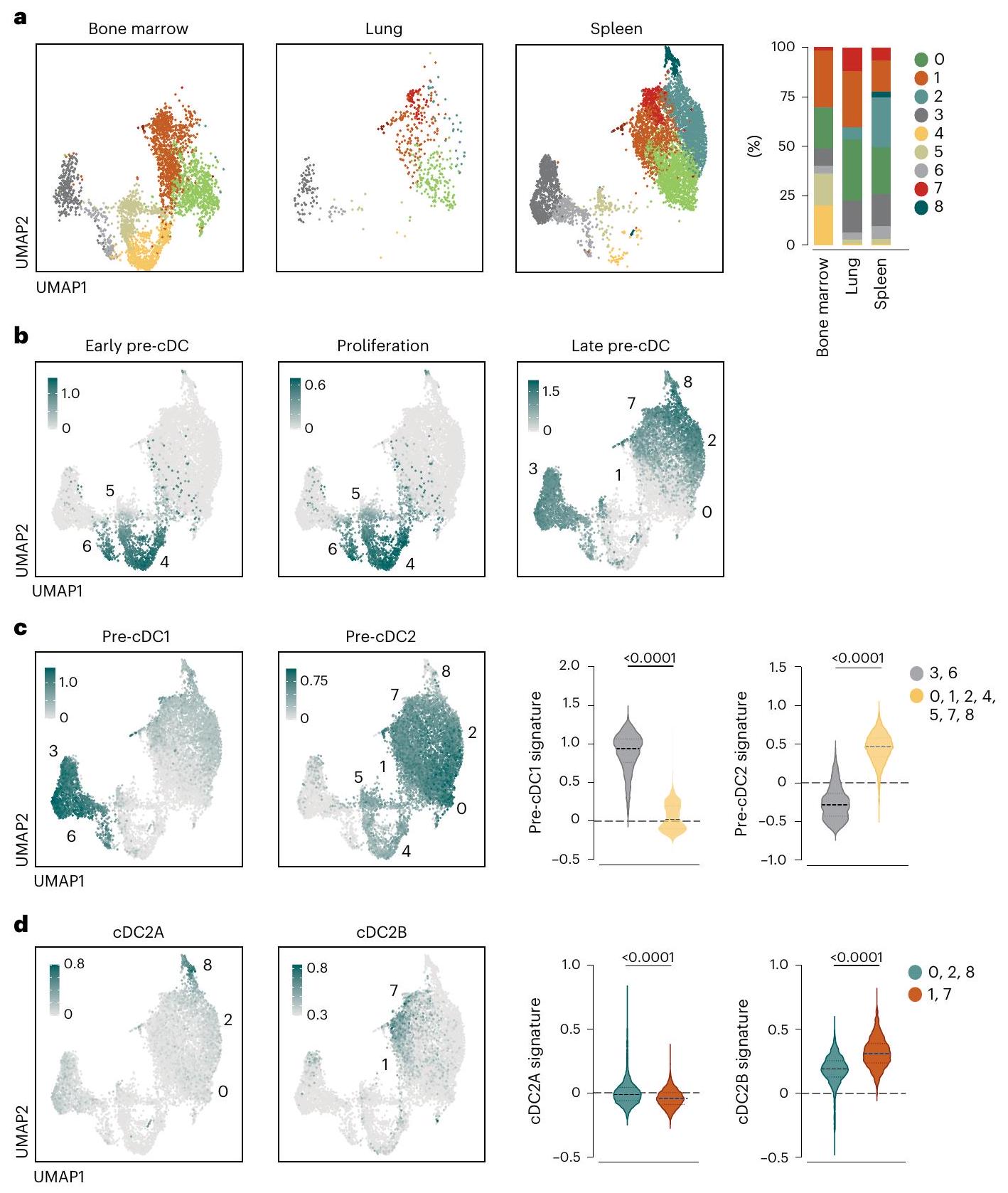 بعد ذلك، حددنا خلايا ما قبل الخلايا dentritic (pre-cDCs) في الأنسجة باستخدام بروتوكول تم تطويره لعزل خلايا ما قبل الخلايا dentritic في الرئة.. نحن محاطون بـسيربCD135قرص مضغوطالخلايا مع استبعاد Ly6Dالخلايا (سابقة لكل من الخلايا البلازمية) و tDCs ) و CD11b سيربCD16الخلايا (خلايا شبيهة بالوحيدات وخلايا DC3 السلفية) ) (الشكل 3a من البيانات الموسعة). باستخدام اختبارات التمايز في المختبر (الشكل 3b من البيانات الموسعة)، ورسم مصير الخلايا (الشكل 3c من البيانات الموسعة) واعتماد الليغاند الخاص بكيناز التيروزين الشبيه بـ Fms (Flt3L) في الجسم الحي (الشكل 3d من البيانات الموسعة)، أكدنا أن استراتيجية التصفية حددت خلايا ما قبل cDCs الحقيقية في نخاع العظام والطحال، كما تم إظهاره سابقًا للرئة.استخدمنا استراتيجية البوابة (الشكل 3e من البيانات الموسعة) لفرز خلايا ما قبل الخلايا الجذعية الدموية (pre-cDCs) من نخاع العظام والطحال والرئة لفئران C57BL/6J من النوع البري (WT). قمنا بإجراء تحليل تسلسل RNA على مستوى الخلية الواحدة (scRNA-seq) على 2,649 خلية ما قبل الخلايا الجذعية الدموية من نخاع العظام، و4,371 خلية من الطحال، و358 خلية من الرئة بعد استبعاد عدد قليل من الخلايا الميتة والملوثات (التي تم تحديدها باستخدام ملفات النسخ الجيني لخلايا المناعة؛https://www. immgen.org/) (الشكل 2أ). قمنا بدمج الأنسجة الثلاثة (نخاع العظم، الطحال والرئة) وأنشأنا خريطة UMAP التي حددت تسعة تجمعات، على الرغم من اختلافها في النسبة، إلا أنها تداخلت عبر جميع الأنسجة (الشكل 2أ). لذلك، قمنا بدمج الخلايا من جميع الأنسجة واستخدمنا توقيعات الجينات المنشورة.لتعليق على تجمعات UMAP. أظهرت هذه الطريقة أن التجمعات 4 و5 و6 تت correspond إلى الخلايا الجذعية القشرية المبكرة المتكاثرة (الشكل 2ب). كانت غنية في نخاع العظام (الشكل 2أ، ب)، وهو ما يتماشى مع حقيقة أنها تنشأ في هذا النسيج. من المحتمل أن تمثل التجمعات 0 و1 خلايا ما قبل القشرية المتمايزة أكثر والتي على وشك مغادرة نخاع العظام.أو ما يُعرف بـ pre-cDCs التي استعمرت مؤخرًا الأنسجة المحيطية (الشكل 2ب). كانت المجموعات 3 و2 و7 و8 (late pre-cDCs) مفرطة التمثيل في الأنسجة المحيطية (الشكل 2أ، ب)، حيث تكمل pre-cDCs تمايزها إلى cDCs.. بشكل عام، تم تقسيم الخلايا السابقة لـ cDCs إلى مجموعتين: واحدة تتكون من الكتل 3 و 6 مع توقيع تعبير جيني للخلايا السابقة لـ cDC1s/cDC1s؛ والأخرى تتكون من الكتلو 8 ومشابهة في التعبير الجيني لـ pre-cDC2s/cDC2s (الشكل 2c)لم نحدد أي