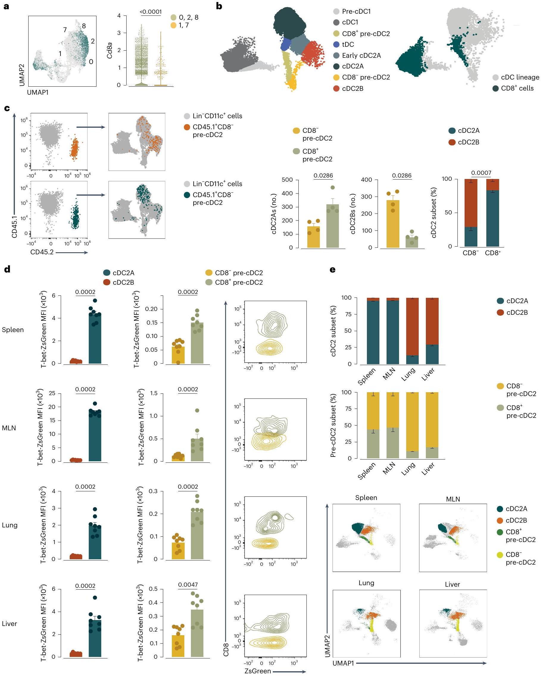 الشكل 3 | الخلايا الجذعية المحيطية pre-cDC2s مائلة نحو مصير cDC2A أو cDC2B. أ، رسم بياني للميزات (يسار) ورسم بياني على شكل كمان (يمين) يظهر تعبير Cd8a على UMAP المدمج أو في مجموعات الكتل 0 و 2 و 8، أو 1 و 7، كما في الشكل 2b-d. ب، UMAP تمثيلي لتحليل تدفق السيتومتر للخلايا الجذعية pre-cDC والسكان cDC التي تم إنشاؤها على CD11c.لينالخلايا باستخدام CD11c، MHC-II، CD26، CD64، CD88، XCR1، SIRPإسام، CLEC12A، CD11b، CD43، CD135، CD117، Ly6C و CD8 (يسار)، و CD8 الخلايا المرسومة فوق UMAP (يمين). ج، CD45.2cDC2s (المستمدة من CD8أو CD8تم استرداد (pre-cDC2s) من الطحال لفئران المتلقين CD45.1 وتم وضعها على UMAP تمثل سلالة cDC للمضيف (يسار) وتحليل تدفق الخلايا يظهر العدد والنسبة المئوية لـ WT CD45.2 EsamcDC2As و CLEC12Aتم استرداد cDC2Bs من الطحال لمتلقّي الفئران WT CD45.1 بعد 3 أيام من نقل CD8و CD8تجمعات CD45.2 pre-cDC2s (يمين). يتم توضيح التجمعات في ب. د، متوسط شدة الفلورة ZsGreen (بعد الطرح من) خلفية الفلورة الذاتية) في cDC2As و cDC2Bs أو CD8أو CD8خلايا ما قبل cDC2 من فئران T-bet-ZsGreen ومخططات تدفق تمثيلية مع م overlaypre-cDC2s وpre-cDC2s في الطحال، MLN، الرئة والكبد توضح تعبير T-bet-ZsGreen (شدة الفلورية) في كل مجموعة من pre-cDC2. e، نسبة cDC2As و cDC2Bs أو CD8أو CD8 pre-cDC2s في الطحال، العقد اللمفية المتوسطة، الرئة والكبد، وUMAP التمثيلي للطحال، العقد اللمفية المتوسطة، الرئة والكبد يظهر المجموعات التي تحتوي على cDC2As وcDC2Bs أو CD8أو CD8pre-cDC2s. في ج، د، كل نقطة تمثل فأراً واحداً (في و في د، هـ)؛ تم تجميع البيانات من تجربتين (المتوسط س.م.; الوسيط IQR لرسم الكمان). في (ج-هـ)، تأتي الكميات من UMAPs (كما هو موضح في وشكل البيانات الموسعة الشكل 4c-e). اختبار مان-ويتني ذو الذيلينتم استخدام -test للمقارنة.القيم موضحة أعلاه الرسوم البيانية. في بعض الأنسجة (الشكل 3أ، الشكل التمديدي 4ج-هـ والجدول التكميلي 2). باستخدام تحليل تدفق الخلايا، أكدنا أنتضمنت خلايا ما قبل cDC2s خلايا CD8و CD8الخلايا (الشكل 3ب والشكل الإضافي 4أ، ج-هـ). تحليل UMAP لـخلايا الطحال ملونة لعدة علامات cDC و pre-cDC موضوعة CD8pre-cDC2s على فرع يؤدي إلى cDC 2 B، وpre-cDC2s على مسار متميز يؤدي إلى cDC2A (الشكل 3b والشكل الإضافي 4c,d). قمنا بفرز CD8 من الطحالما قبل cDC2s و CD8pre-cDC2s (الشكل 4a من البيانات الموسعة) وتم إجراء تحليل تسلسل RNA الكمي الشامل (الشكل 5a من البيانات الموسعة). تم استخدام الجينات المعبر عنها بشكل مختلف (DEGs) من أي من السكان (الجدول التكميلي 3) كعلامة جينية، والتي عند تراكبها على تحليل UMAP السابق لتسلسل RNA أحادي الخلية (الشكل 5b من البيانات الموسعة)، أشارت إلى أن CD8كان قادرًا بالفعل على فصل المكونات المحتملة لـ cDC2As (CD8pre-cDC2s) و cDC2Bs (CD8pre-cDC2s) في طحال الفأر (الشكل 5b من البيانات الموسعة). كما أشار هذا التحليل إلى أنه على الرغم من أن tDCs تعبر عن CD8كان ملف تعبير الجينات لديهم مميزًا عن ذلك الخاص بـ CD8pre-cDC2s (الشكل 5a من البيانات الموسعة).