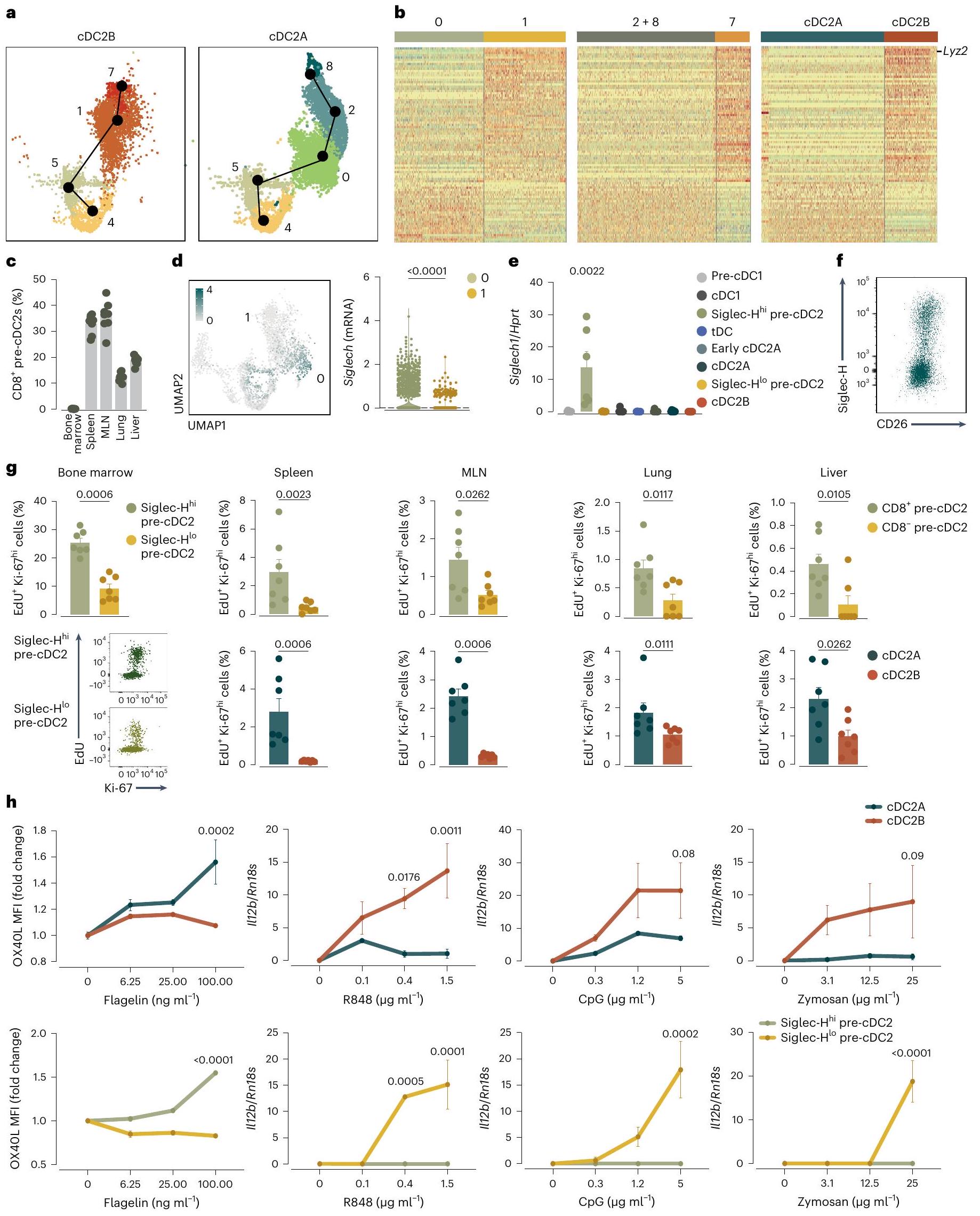 على عكس الأنسجة الطرفية، لم نكتشف تعبير CD8في أي من الخلايا السابقة لـ cDC2 في نخاع العظام (الشكل 4c). ومع ذلك، حدد تحليل تسلسل RNA أحادي الخلية (scRNA-seq) وPCR الكمي مع النسخ العكسي (RT-qPCR) Siglec-H كعلامة محتملة للخلايا السابقة لـ cDC2 في المجموعة 0 (الشكل 4d,e). أكد تحليل تدفق الخلايا أن الخلايا السابقة لـ cDC2 في نخاع العظام يمكن فصلها إلى Siglec-و سيجلك-السكان (الشكل 4f والشكل الإضافي 7a-d). كان تعبير Siglec-H منخفضًا جدًا في pre-cDC2s أو cDC2s من الأنسجة المحيطية، مثل الطحال (الشكل الإضافي 8a)، مما يشير إلى أن تعبير Siglec-H فقد في وقت مبكر عندما تمايزت pre-cDCs إلى late pre-cDCs التي تغادر نخاع العظام، وهو ما يتماشى مع التقارير السابقة.. وبناءً عليه، أظهرت تحليل بيانات تسلسل RNA أحادي الخلية أن تعبير Siglech كان أعلى في الخلايا في الكتلة 0 وأقل في الخلايا المتميزة أكثر pre-cDC2As في الكتل 2 و 8 (الشكل 8b من البيانات الموسعة). قمنا بفرز Siglec- و سيجلك-تم الحصول على خلايا pre-cDC2s من نخاع العظم وأُجري تحليل تسلسل RNA الجماعي للحصول على توقيع DEG لكلتا المجموعتين (الشكل 8c-d من البيانات الموسعة والجدول التكميلي 5). عند رسمها على UMAP لتسلسل RNA أحادي الخلية، كان توقيع Siglec-تم تسليط الضوء على خلايا pre-cDC2s في المجموعات 0 و2 و8، في حين أن توقيع Siglec-تم تسليط الضوء على خلايا pre-cDC2s في المجموعات 1 و 7 (الشكل 8d من البيانات الموسعة). استخدمنا أيضًا تحليل المكونات الرئيسية (PCA) لاستكشاف العلاقة بين Siglec- نخاع العظام.pre-cDC2s و