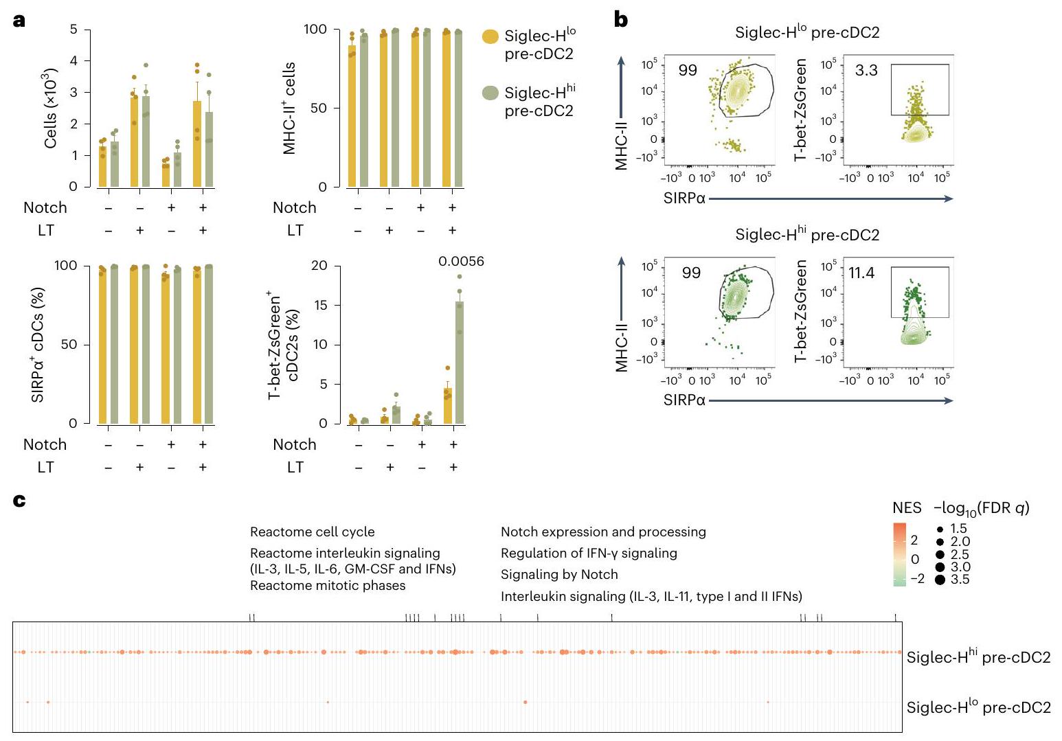 CD8كما في الشكل 4c-e من البيانات الموسعة، تراكب RFP و eGFP الخلايا في cDC2As و CDC 2 Bs وأوما قبل cDC2s. ج، نسبةأو eGFPcDC2As و cDC2Bs و pre-cDC1s و CD8pre-cDC2s أو CD8تم تحديد الخلايا السابقة لـ cDC2 باستخدام UMAPs كما هو موضح في الشكل 4c-e من البيانات الموسعة من الطحال، العقد اللمفاوية المتوسطة، الرئة والكبد من SigHليزفئران. بوابات لطلب تقديم العروضو GFPتم إعداد الخلايا باستخدام نظائرها من خلايا الفئران البرية. كل نقطة تمثل فأراً واحداً ( ); البيانات من إحدى التجربتين (المتوسط تم استخدام تحليل التباين الأحادي (ANOVA) مع تصحيح توكي للمقارنة.القيم موضحة أعلاه الرسوم البيانية. و سيجلك-تمت زراعة خلايا pre-cDC2s مع Flt3L فقط، وتمايزت إلى cDC2s، كما تم قياسه من خلال زيادة تعبير MHC-II و SIRP. (الشكل 5أ). ومع ذلك، لم تؤد إلى ظهور T-bet-ZsGreenالخلايا ما لم يتم زراعتها مع خلايا التغذية OP9-DL4، التي توفر جزيئات Notch (الشكل التمديدي 8e)، في وجود اللمفوتوكسين الفأري المعاد التركيب (الشكل 5a، b). في هذا السياق، Siglec-pre-cDC2s، ولكن ليس Siglec-pre-cDC2s، تم إنتاج T-bet-ZsGreencDC2As (الشكل 5أ، ب). هذا أكد على الأهمية إشارات Notch في مسار تمايز cDC2A وقد دفعنا ذلك لتقييم تأثيره على pre-cDC2s. على الرغم من أن C9a و C9a كان لدى الفئران أعداد مكافئة من Siglec-و سيجلك-pre-cDC2s في نخاع العظام ووpre-cDC2s في المحيط (الشكل 8f من البيانات الموسعة)، أظهر تحليل تسلسل RNA الكمي الشامل أن pre-cDC2s من نخاع العظامأظهرت الفئران المعدلة جينياً ملف تعبير جيني متغير (الشكل 8g من البيانات الموسعة والجدول 6 التكميلي).