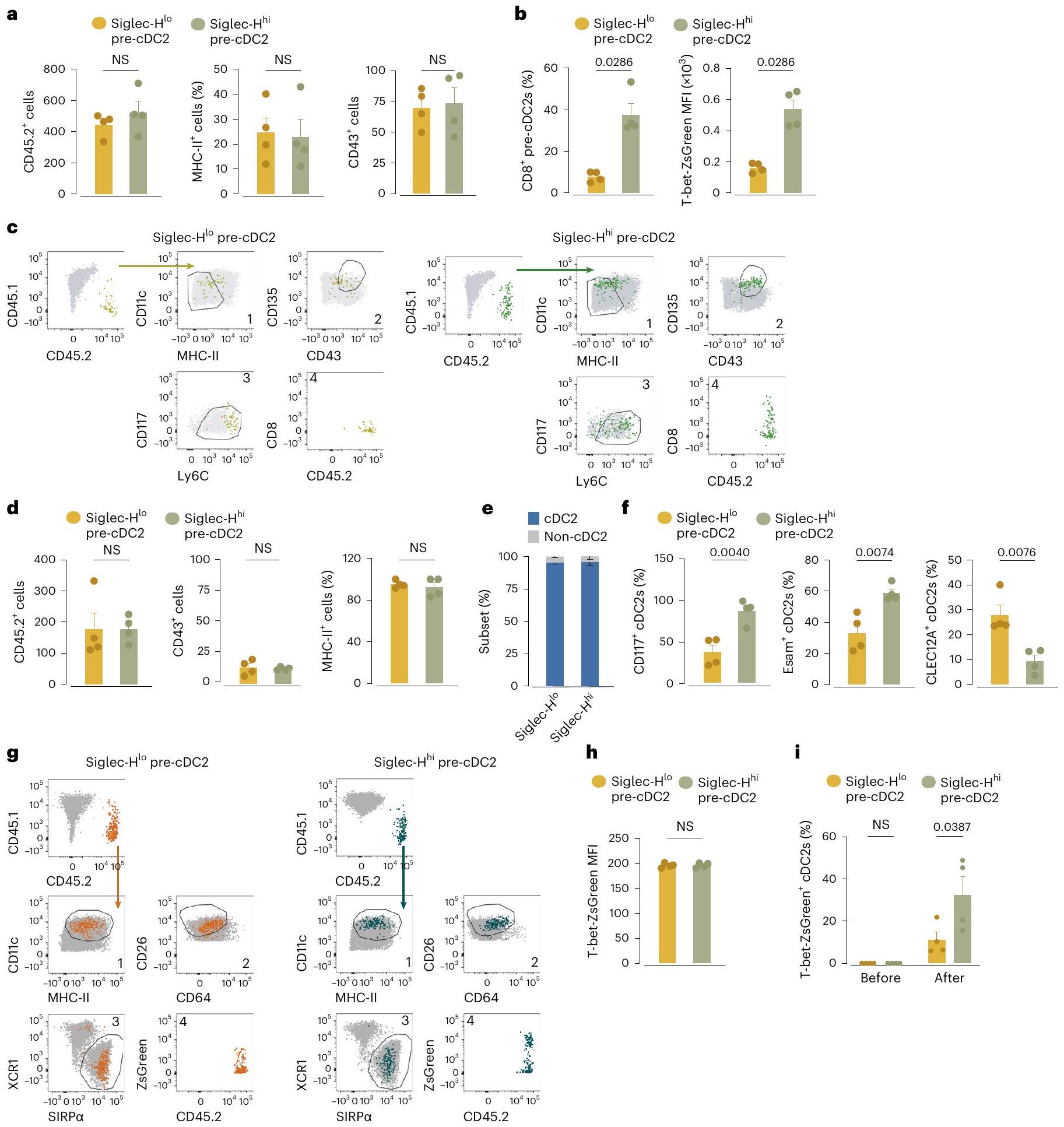 CLEC12A (%) على CD45.2الخلايا المعزولة من فئران T-bet-ZsGreen والمستعادة من فئران CD45.1 WT كما في (د). ج، تصنيف يدوي لتأكيد تحليل UMAP المستخدم في التكميم في (د-ف). ح، MFI لـ T-bet-ZsGreen على Siglec-و سيجلك- pre-cDC2s من نخاع العظام لفئران T-bet-ZsGreen قبل النقل. تم طرح الفلورة الذاتية الخلفية عن طريق تحديد خلايا مكافئة من فئران WT. i، T-bet-ZsGreenفي سيجلك-أو سيجلك-الخلايا السابقة لـ cDC2s (أو نسلها بعد النقل) المعزولة من نخاع العظام لفئران CD45.2 T-bet-ZsGreen قبل النقل أو بعد 6 أيام من النقل إلى فئران CD45.1 WT (كما في d). كل نقطة تمثل فأراً واحداً.بما في ذلك ); البيانات هي مجموعة من تجربتين (المتوسط م.م.). اختبار مان-ويتني ذو الذيلين-اختبارأو تحليل التباين ثنائي الاتجاه (مع تصحيح توكي، i) تم استخدامه لمقارنة مصير سيجلك-و سيجلك-ما قبل cDC2s.القيم موضحة أعلاه الرسوم البيانية. NS، غير دالة.