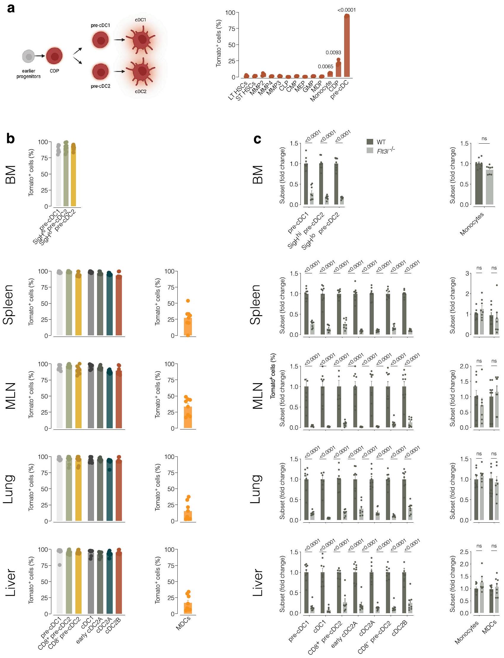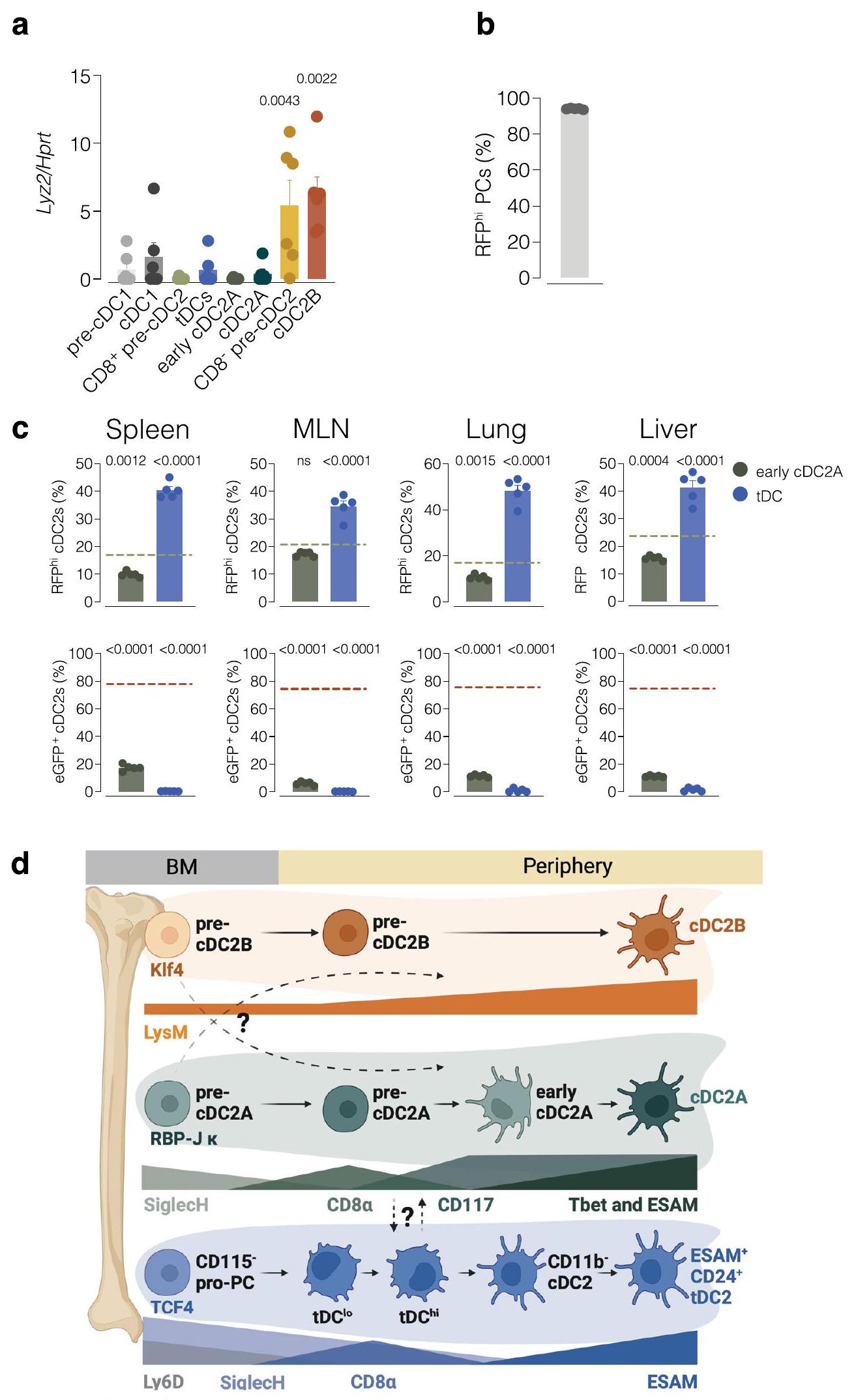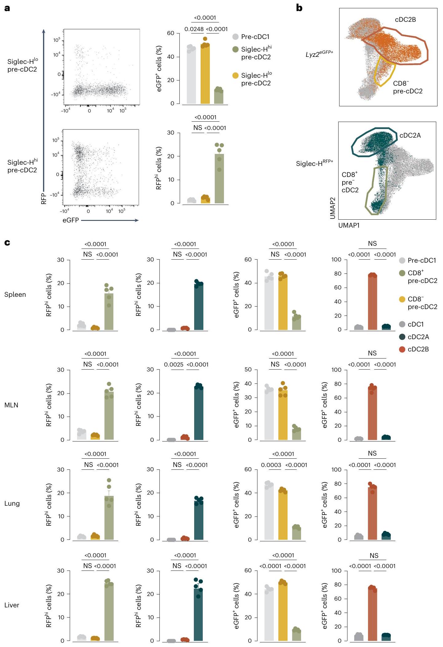 لتأكيد هذه النتائج دون نقل الخلايا أو الإشعاع، استخدمنا Siglech روزا26 فئران (يشار إليها فيما بعد بـ SigH )، التي تتبع نسل سلفيات تعبر عن Siglec-H . في الوقت نفسه، سعينا لتعريف pre-cDC2Bs و cDC2Bs بشكل مستقل عن عدم تعبير Siglec-H و CD8أو T-bet. أظهرت تحليل التعبير الجيني لخطوط cDC2A مقابل cDC2B (الشكل 4 ب والشكل التمديدي 9أ) أن LysM (Lyz2) قد يعمل كعلامة للأخيرة. بناءً على ذلك، قمنا بعبور SigHفئران إلىضغط المراسللإنشاءليزالفئران. الخلايا البلازماوية، التي تعبر عن سيجلك-كان بروتين الفلورسنت الأحمر (RFP) من نوع Siglec-Hفي هذه الفئران (الشكل التوضيحي الممتد 9ب). نسبة عالية من ( ) من tDCs كانت أيضًا Siglec-H-RFP (الشكل 9c من البيانات الموسعة)، وهو ما يتماشى مع الفكرة التي تفيد بأنهم يمكنهم التعبير عن Siglec-H وينحدرون من Siglec-سلف الخلايا البلازماوية. في سلالة cDC، وُجد وسم Siglec-H-RFP في نخاع العظام Siglec-pre-cDC2s ) ولكن ليس سيجلك – pre-cDC2sأو ما قبل cDC1s (الشكل 7أ)، بينما تم العثور على تعبير بروتين الفلورسنت الأخضر المعزز بـ LysM (eGFP) في Siglec-pre-cDC2sسيجلك-pre-cDC2sو pre-cDC1s ( ) (الشكل 7أ). على الرغم من أن تعبير Siglec-H قد انقطع عندما غادرت خلايا pre-cDC2A نخاع العظام، إلا أن الثنائية ظلت محفوظة عبر الأعضاء اللمفاوية وغير اللمفاوية المحيطية: تكرار Siglec-كانت الخلايا أعلى بين الأنسجةما قبل cDC2s أكثر من CD8pre-cDC2Bs أو pre-cDC1s (CD8pre-cDC2s:; CD8 pre-cDC2s:; ما قبل cDC1s: )، بينما كان العكس صحيحًا لخلايا LysM-eGFP (CD8pre-cDC2s:; CD8 ما قبل cDC2s:; ما قبل cDC1s: ) (الشكل 7ب، ج). في حجرة cDC2 المتمايزة، كان وسم Siglec-H-RFP مقصورًا إلى حد كبير على EsamcDC2As و cDC2As المبكرة، تعكس تسمية CD8تمت ملاحظة تعبير LysM-eGFP بشكل تفضيلي في CLEC12AcDC2Bs وكانت غائبة في cDC1s (الشكل 7ب، ج). كانت هذه البيانات متسقة مع الفكرة القائلة بأن cDC2As و cDC2Bs مشتقة من Siglec- متميزة. و LysM السابقة (الشكل 9d من البيانات الموسعة).