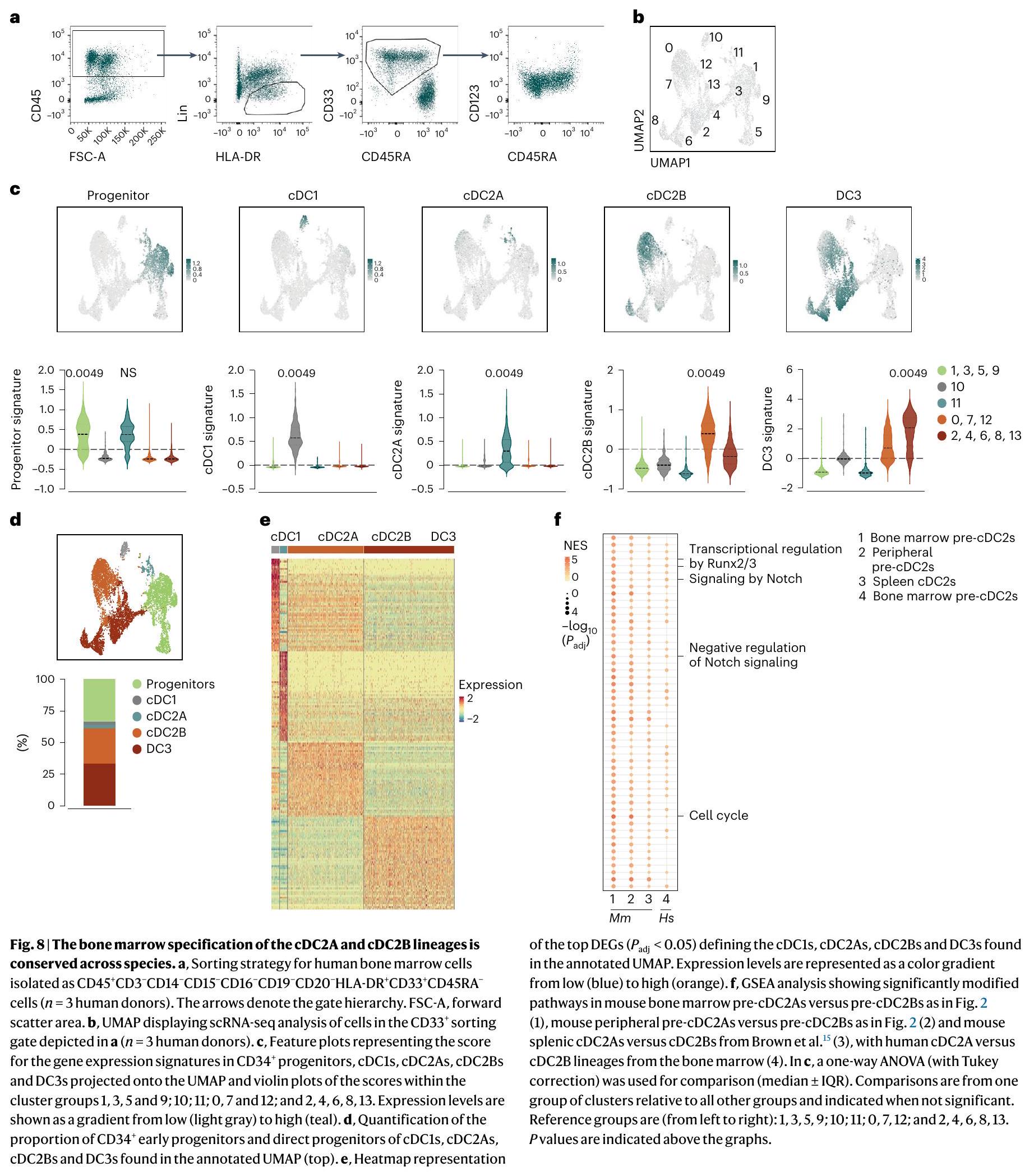 حددنا مجموعة صغيرة منيمكن تقسيم الخلايا السابقة لـ cDCs إلى مجموعتين تشبهان cDC2As أو cDC2Bs (الشكل التمديدي 10a، b)، مما يشير إلى أن الطحال البشري يحتوي على pre-cDC2As و pre-cDC2Bs. لتقييم ما إذا كانت هذه الخلايا السابقة لـ cDC2s يمكن العثور عليها أيضًا في نخاع العظام، قمنا بتنقيتها باستخدام استراتيجية تصنيف تم تطويرها سابقًا لخلايا cDCs في الدم البشري وسابقاتها.. CD3- CD14-CD15- CD1 تم فرز الخلايا من نخاع العظام للمتبرعين البشر (الشكل 8أ) وخضعت لتحليل تسلسل RNA أحادي الخلية. بعد استبعاد عدد قليل من الملوثات، قمنا بإنشاء خريطة UMAP تضمنت 8,240 خلية و14 مجموعة (الشكل 8ب). استخدمنا توقيعات جميع مجموعات خلايا DC التي تم تحديدها سابقًا في البشر، بما في ذلك cDC1 وcDC2A وcDC2B وDC3 (المراجع 15، 21، 23) (الجدول التكميلي 7) لتوضيح المجموعات وشملنا توقيعًا للخلايا السلفية. (الجدول التكميلي 7) لتصور اتجاه التمايز. وُجدت السلف السابقة في المجموعات 1 و3 و5 و9 بينما احتوت المجموعة 10 على سلالة pre-cDC1/cDC1 (الشكل 8c). أظهرت المجموعة 11 أعلى درجة لتوقيع cDC2A بينما وُجدت pre-cDC2Bs/cDC2Bs في المجموعات 0 و7 و12 وDC3s في المجموعاتو 13 (الشكل 8c). بشكل عام، وجدنا ثلاث مجموعات متميزة من الخلايا الجذعية المبدئية/ الخلايا الجذعية الناضجة (cDC1 و cDC2A و cDC2B)، و DC3s (الشكل 8d، e والجدول التكميلي 8). من الجدير بالذكر أن تحليل المسار الجيني (GSEA) الذي يقارن بين سلالات cDC2 في الفئران إلى جانب cDC2A/cDC2A البشرية (العنقود 11) وcDC2B/pre-cDC2B (العناقيد 0 و7 و12) أظهر تداخلًا كبيرًا في المسارات التي كانت غنية في سلالة cDC2A عبر الأنواع (الشكل 8f). وبالتالي، يبدو أن تحديد مجموعة cDC2A/cDC2B محفوظ عبر الفئران والبشر.