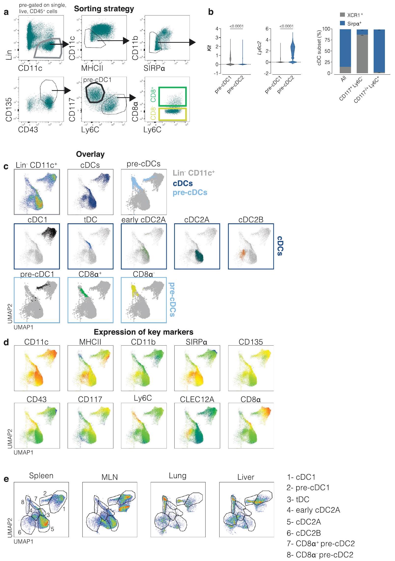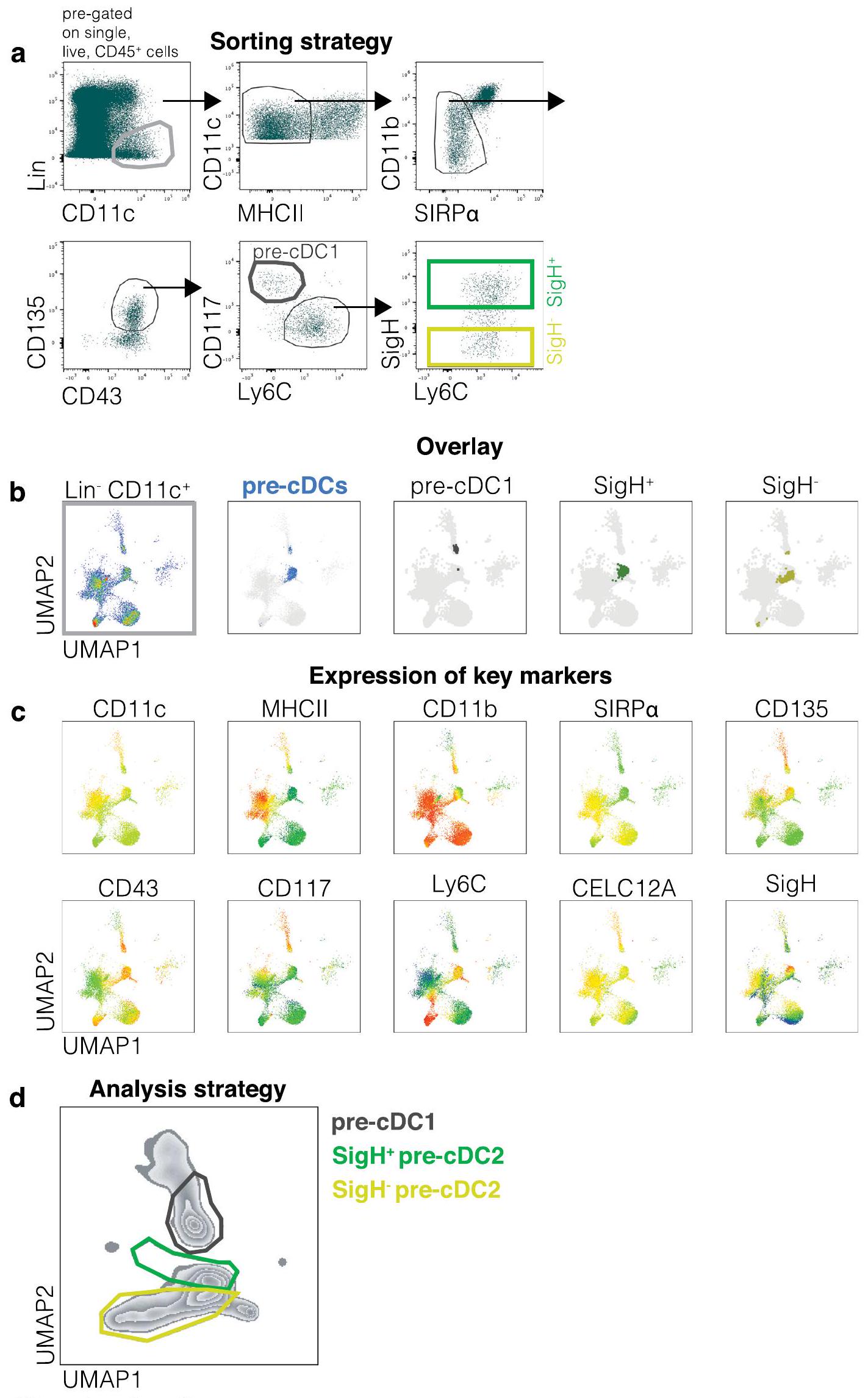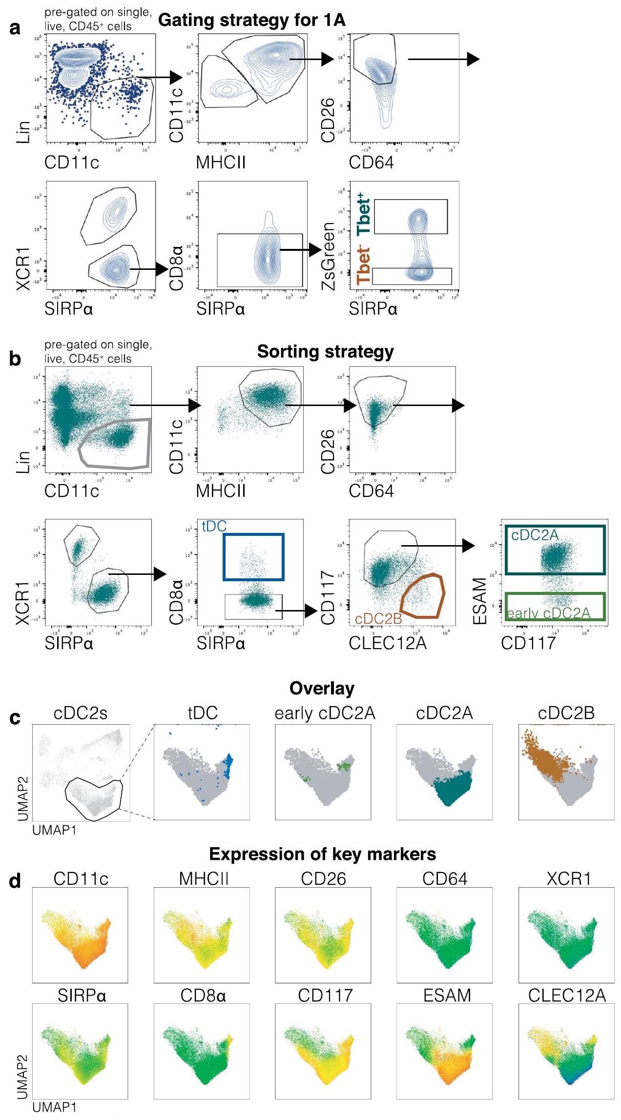 استخدمنا Comet، أداة للتنبؤ بعلامات سطح الخلايا السكانية من بيانات scRNA-seq.لتصميم استراتيجية لتحديد مجموعات ما قبل الخلايا الجذعية المشتقة من الخلايا الدندريتية باستخدام تقنية تحليل التدفق الخلوي. حددت كوميت العلامات التي تم استخدامها سابقًا لتمييز ما قبل الخلايا الجذعية المشتقة من الخلايا الدندريتية 1 (CD117 وCD24) عن ما قبل الخلايا الجذعية المشتقة من الخلايا الدندريتية 2 (Ly6C وCD115، من بين آخرين). (الجدول التكميلي 2)، وقد أكدنا دقته باستخدام اختبارات التمايز في المختبر (الشكل 4a,b من البيانات الموسعة). كما حددت Comet CD8كعلامة لـ cDC2As المفترضة، بالإضافة إلى تمييز cDC1s و tDCs