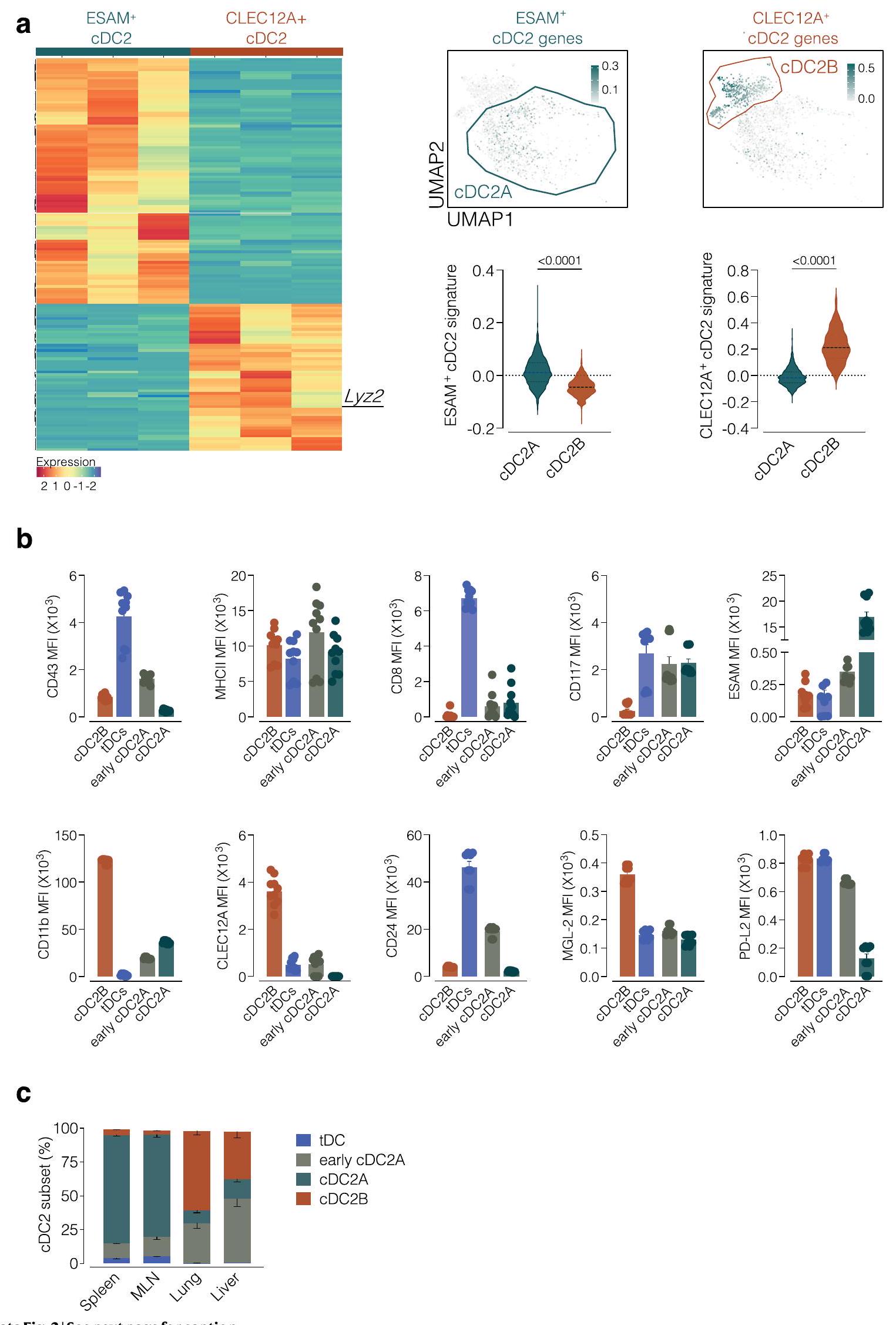 سي إل إي سي 12 إيهCD24مجل-2أو PD-L2cDC2s على UMAP (في المنتصف) وشدة الفلورية المتوسطة لـ ZsGreen (MFI – بعد طرح خلفية الفلورية الذاتية) في cDC2Bs و cDC2As و early cDC2As و tDCs المحددة في UMAP (في الأسفل). ج، تحليل تدفق الخلايا يظهر قياس cDC2Bs و cDC2As و early cDC2As و tDCs من الطحال و MLN والرئة والكبد من C9a. و فئران. كل نقطة تمثل فأراً واحداً (في و في ). البيانات من واحدة من اثنتين ( ) أو مجموعة من اثنين ( تجارب (تعنيم.م.). اختبار مان-ويتني ذو الذيلين-تم استخدام اختبار لمقارنة المجموعات (في، المقارنة نسبية بالنسبة لـ cDC2B).القيم موضحة أعلاه الرسوم البيانية.