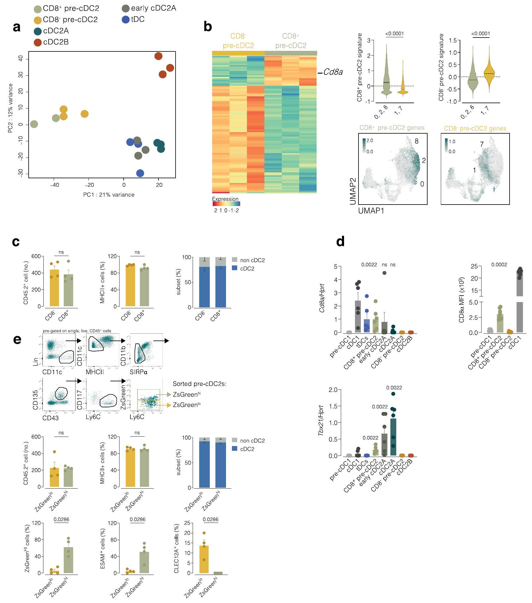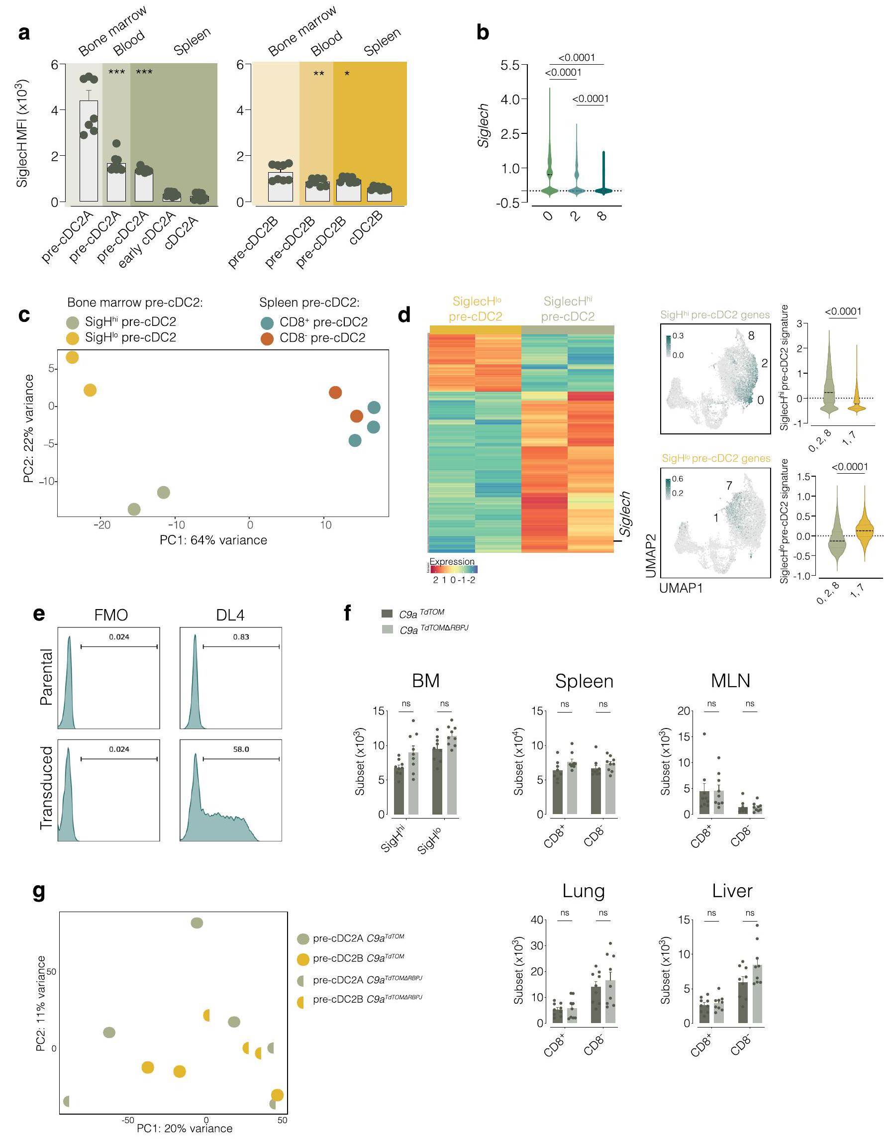 سيجلك-pre-cDC2s وpre-cDC2As وتم العثور على pre-cDC2Bs في الطحال. فصل المكون الرئيسي 1 الخلايا وفقًا للأنسجة، بينما فصل المكون الرئيسي 2 الخلايا وفقًا للمجموعة الفرعية (الشكل البياني الممتد 8c)، مما يشير إلى التشابه بين Siglec-وpre-cDC2s و Siglec-و CD8pre-cDC2s.