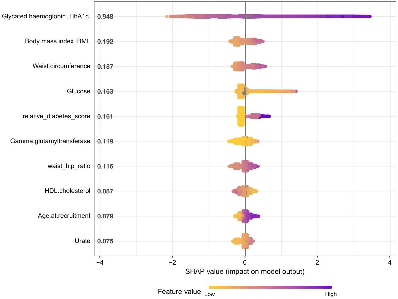 أظهر HbA1c أقوى قدرة تنبؤية لمرض السكري من النوع 2، يليه مؤشر كتلة الجسم، محيط الخصر، مستويات السكر في الدم، عدد الأقارب من الدرجة الأولى المصابين بالسكري، GGT، نسبة الخصر إلى الورك، كوليسترول HDL، العمر، ومستويات اليورات. كانت القيم المرتفعة للمتغيرات الخام مرتبطة إيجابيًا بزيادة خطر الإصابة بالسكري عبر جميع المتغيرات باستثناء كوليسترول HDL، حيث كانت القيمة العالية مرتبطة بانخفاض خطر الإصابة بالسكري (الشكل 1).