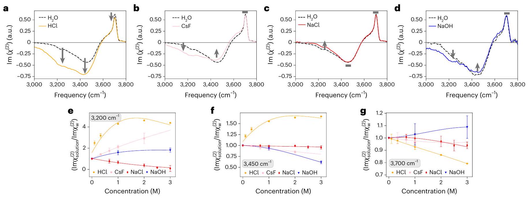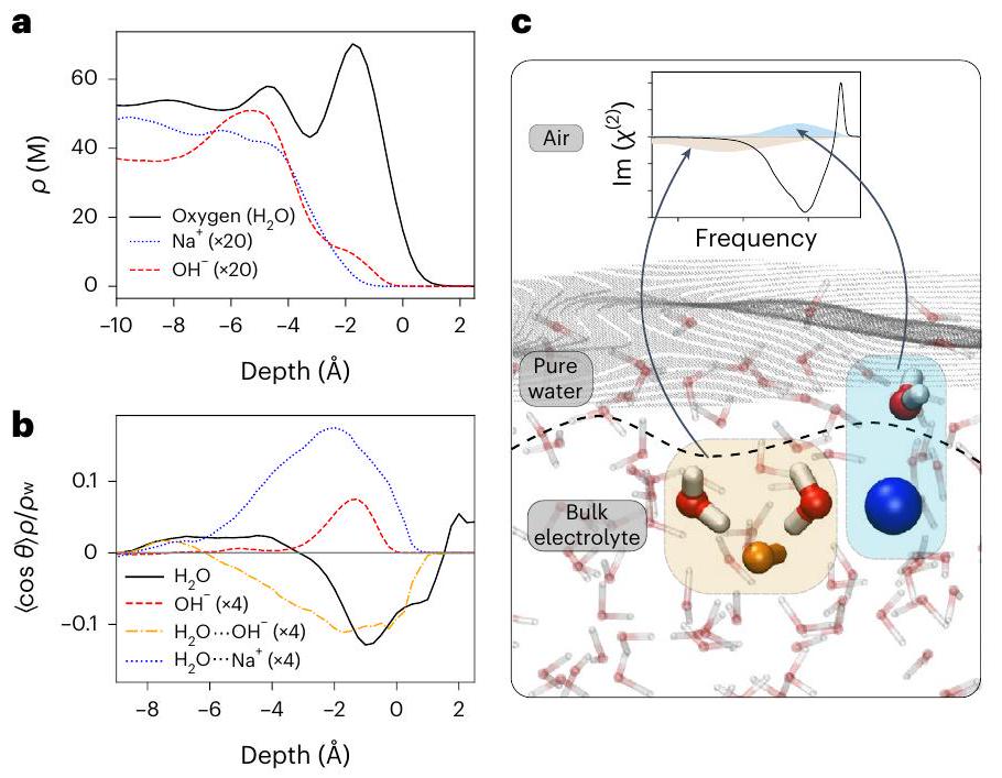 of electrolytes, together with the high accuracy of the measurements (Supplementary Fig. 26), enabled the observation of the subtleties of the water-ion interactions, and enabled a critical revision of the domain of applicability of the established EDL picture. More specifically, assuming the formation of an EDL, water molecules within the EDL are predicted to polarize in a single direction-either pointing upwards or downwards. Although it is possible to differentiate the effects of water interacting with ions of varying charges, these contributions would consistently exhibit the same polarity. In contrast, the stratified model accounts for dual polarization, where water can simultaneously orient both upwards and downwards, in alignment with the experimental observations. The stratification picture and the importance of water-ion interactions demonstrated in this Article substantially expand on current textbook descriptions, providing powerful insights towards resolving the air/water interface puzzle and understanding chemical reactivity at this ubiquitous interface