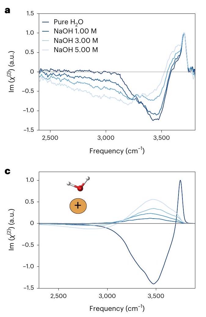 الإلكتروليتات، جنبًا إلى جنب مع الدقة العالية للقياسات (الشكل التكميلي 26)، مكنت من ملاحظة تفاصيل تفاعلات الماء والأيونات، ومكنت من مراجعة نقدية لنطاق تطبيق صورة EDL المعتمدة. بشكل أكثر تحديدًا، بافتراض تكوين EDL، من المتوقع أن تستقطب جزيئات الماء داخل EDL في اتجاه واحد – إما لأعلى أو لأسفل. على الرغم من أنه من الممكن التمييز بين تأثيرات الماء المتفاعل مع الأيونات ذات الشحنات المتنوعة، فإن هذه المساهمات ستظهر باستمرار نفس القطبية. في المقابل، يأخذ النموذج الطبقي في الاعتبار الاستقطاب المزدوج، حيث يمكن للماء أن يتجه في نفس الوقت لأعلى ولأسفل، بما يتماشى مع الملاحظات التجريبية. توسيع صورة التصنيف وأهمية تفاعلات الماء والأيونات التي تم توضيحها في هذه المقالة بشكل كبير على الأوصاف الحالية في الكتب الدراسية، مما يوفر رؤى قوية نحو حل لغز واجهة الهواء/الماء وفهم التفاعلية الكيميائية عند هذه الواجهة الشائعة
