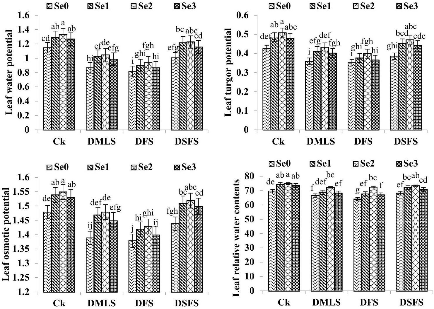 Figure 3. Leaf water potential (-MPa), Leaf turgor potential (MPa), Leaf osmotic potential (-MPa) and Leaf relative water contents (%) of quinoa influenced by Se priming under drought.