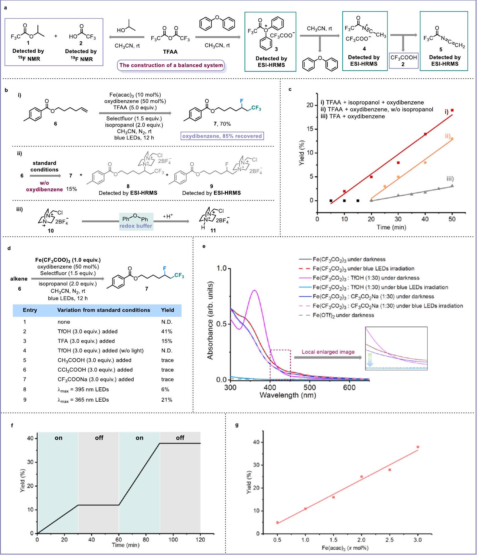 Detailed mechanistic studies were performed to identify the real lightharvesting species. During the investigation of the iron salt catalyst, we found that and behaved satisfying catalytic ability for alkene fluorotrifluoromethylation (Supplementary Table 2, Entries 1 and 2). Therefore, we proposed that these iron salts could be transformed into iron and -based light-harvesting species in the constructed acid and trifluoroacetate ( ) system. This proposal was evidenced by detailed UV-Vis studies (Supplementary Fig. 26). Further stoichiometric experiments revealed that under the blue LED irradiation, can be unlocked and release radicals only in the presence of a strong Brønsted acid (Fig. 2d, Entries 1-4). Weak Brønsted acids or exogenous did not promote the activation of for the fluorotrifluoromethylation of alkene (Entries 5-7). The addition of a Brønsted acid successfully avoided the need for UV light for the transformation of (Entries 8 and 9). The results of UV-Vis studies also indicated that the photodecomposition of would occur only when was subjected to acidic conditions. In the absence of a Brønsted acid, extra could still not assist with the visible light-induced LMCT of (Fig. 2e). Besides, using