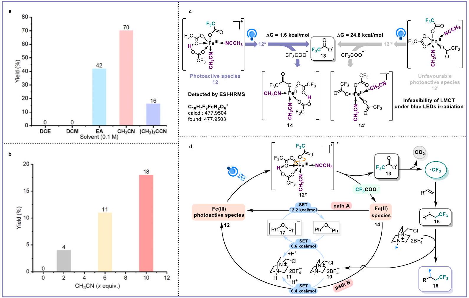 بالإضافة إلى ذلك، خلال تحقيق المذيبات، لاحظنا أنه فقط عندما تمتلك المذيبات القدرة على التنسيق مثل، و يمكن الحصول على المنتج المرغوب فيه من الفلوروتريفلوروميثيليشن. على النقيض من ذلك، فشلت المذيبات مثل ثنائي كلورو الميثان (DCM) وثنائي كلورو الإيثان (DCE) في توليدالجذور (الشكل 3أ). ألهمنا ذلك للتفكير فيما إذاكان متورطًا في تجميع الحديد والأنواع المعتمدة على جمع الضوء (الشكل 3 أ، ب، الجدول التكميلي 3، الشكل التكميلي 33). لتحديد الهيكل الحقيقي للحديد بسرعة والأنواع المعتمدة على جمع الضوء، قمنا بإجراء حسابات نظرية الكثافة الوظيفية (DFT) (الأشكال التكميلية 34-37). كما هو موضح في الشكل 3c، فإن الـ 12 التي يمكن اعتبارها مزيجًا منمعوجزيئان منمن خلال تأثير الروابط الهيدروجينية والتنسيق، يتصرف فعلاً كـ LMCT الفعال بين الحديد والمركبات أحادية الأسنان.تحت إشعاع الضوء الأزرق. وجودتم تحديده بشكل أكبر من خلال تجارب ESI-HRMS (الشكل التوضيحي 24). بدون تأثير الرابطة الهيدروجينية لحمض برونستيد، فإن إطلاقأصبح الجذري 13 من الإثارة 12 غير مواتٍ حراريًا (الأشكال التكميلية 38-42). علاوة على ذلك، في وجود الروابط الهيدروجينية داخل الجزيء، انخفضت طاقة مدار LUMO للحديد بشكل كبير بمقدار 0.86 إلكترون فولت، مما يفيد عملية LMCT المرغوبة (الشكل التكميلية 44). بالنظر إلى أن احتمالالموجود في نظام التفاعل وبناءً على الهيكلاستبدال أحد الروابط الهيدروجينيةمجموعات معلا يمكن استبعاد أن تعمل كبديل غير ضروري لتجمعات من أنواع جمع الضوء المعتمدة على الحديد (انظر الأشكال التكميلية 46-49 لمناقشات مفصلة).
