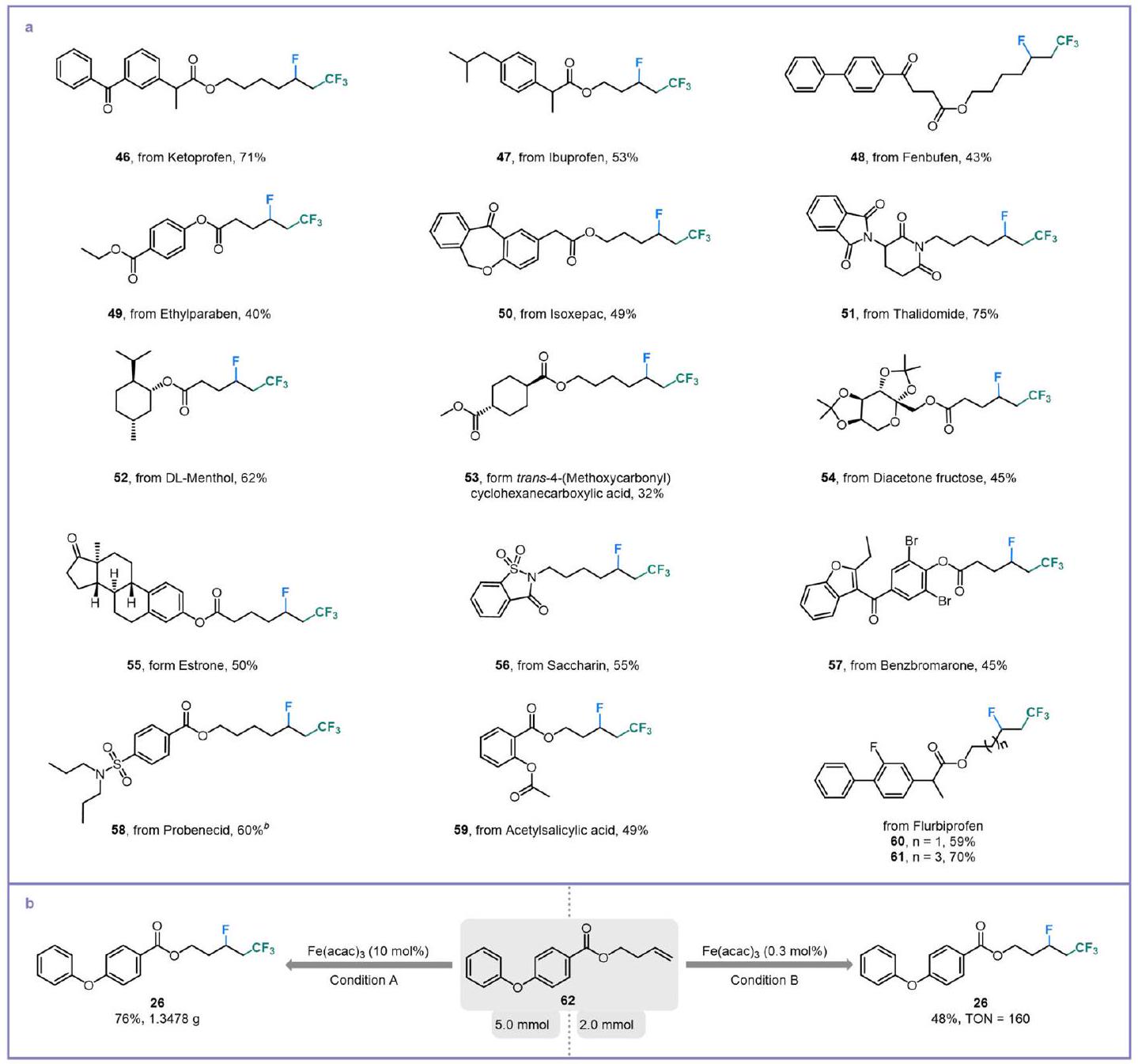 To further showcase the excellent synthetic compatibility of this protocol, a wide variety of complex olefins derived from pharmaceutical molecules were subjected to this Brønsted acid-unlocked iron LMCT photocatalysis condition (Fig. 5a). The indispensable pain-relief drugs such as ketoprofen, ibuprofen, and fenbufen were installed with alkyl fluorides in moderate to good yields (46-48). Additionally, derivatives of the germicide ethyl-paraben and anti-inflammatory agent isoxepac could also be tolerated smoothly ( and ). It is worth noting that the fluorotrifluoromethylation of thalidomide’s derivate was capable of affording 75% yield (51), in which thalidomide is an effective cure for the erythema nodosum leprosum. The introduction of an alkenyl group into DL-menthol (a traditional Chinese medicine for detoxification) produced a satisfying substrate for fluorotrifluoromethylation (52). We also extended this protocol to the transformation of the key medicine intermediates trans-4-(methoxycarbonyl)cyclohexanecarboxylic acid and diacetone fructose to increase the opportunity for further modifications ( and 54). Alkenes with estrone and saccharin scaffolds were both converted into their corresponding products with moderate yields ( and 56). Notably, benzbromarone and probenecid, drugs for the treatment of gout, contain olefin derivatives that were suitable substrates for late-stage fluorotrifluoromethylation ( 57 and 58). Additionally, antipyretic analgesics such as acetylsalicylic acid and flurbiprofen could provide good yields (59-61). The success