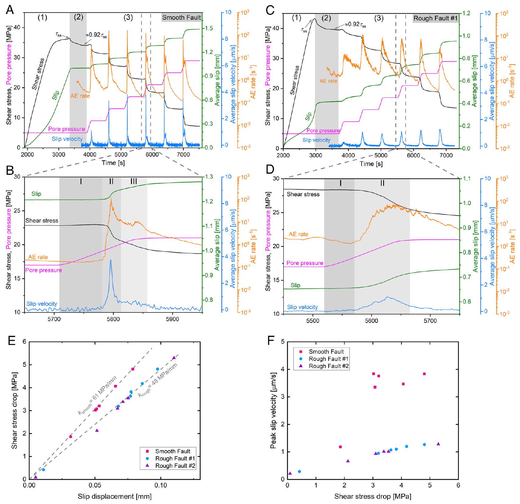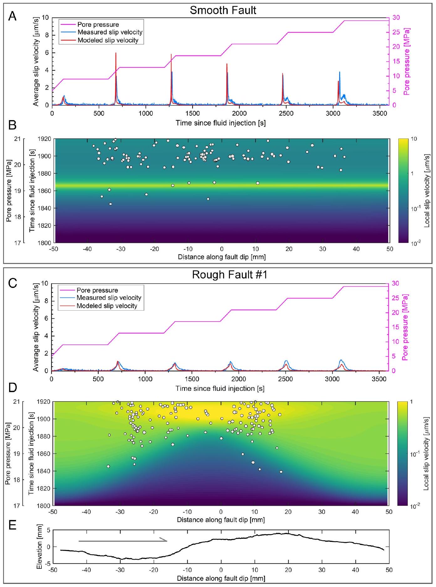 a high local slip rate, accompanied by a sharp localized burst in AE activity (Fig. 5D). This result agrees with spatial distribution of injection-induced AE activity around high-stress asperities where induced seismic moment release of AEs is high but the associated