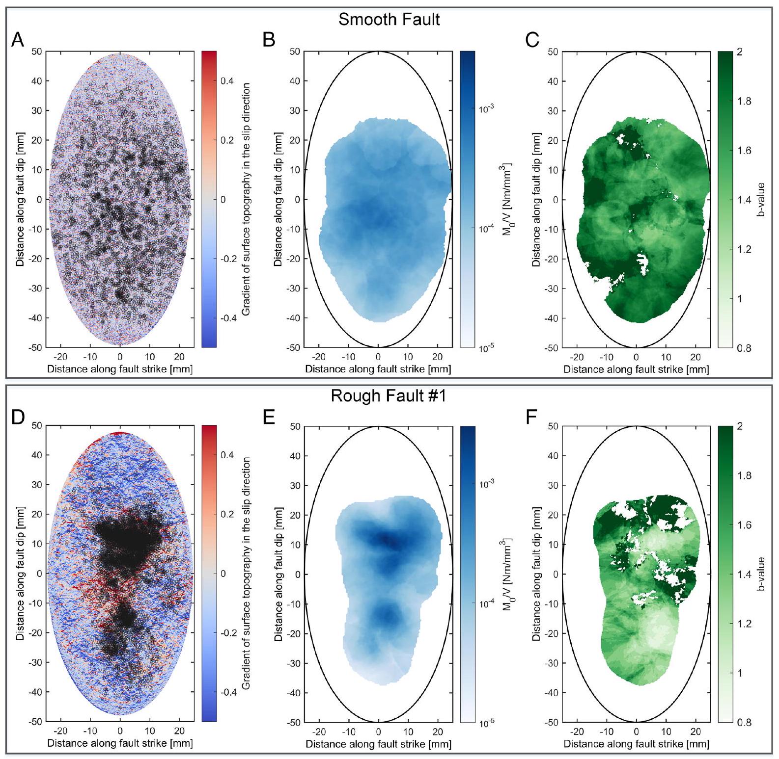 (ملحق SI، القسم 3). توفر الخصائص المكانية والسمات الإحصائية للانبعاثات الصوتية رؤى أساسية حول دور اختلاف خشونة السطح في الزلازل الناتجة عن السوائل.