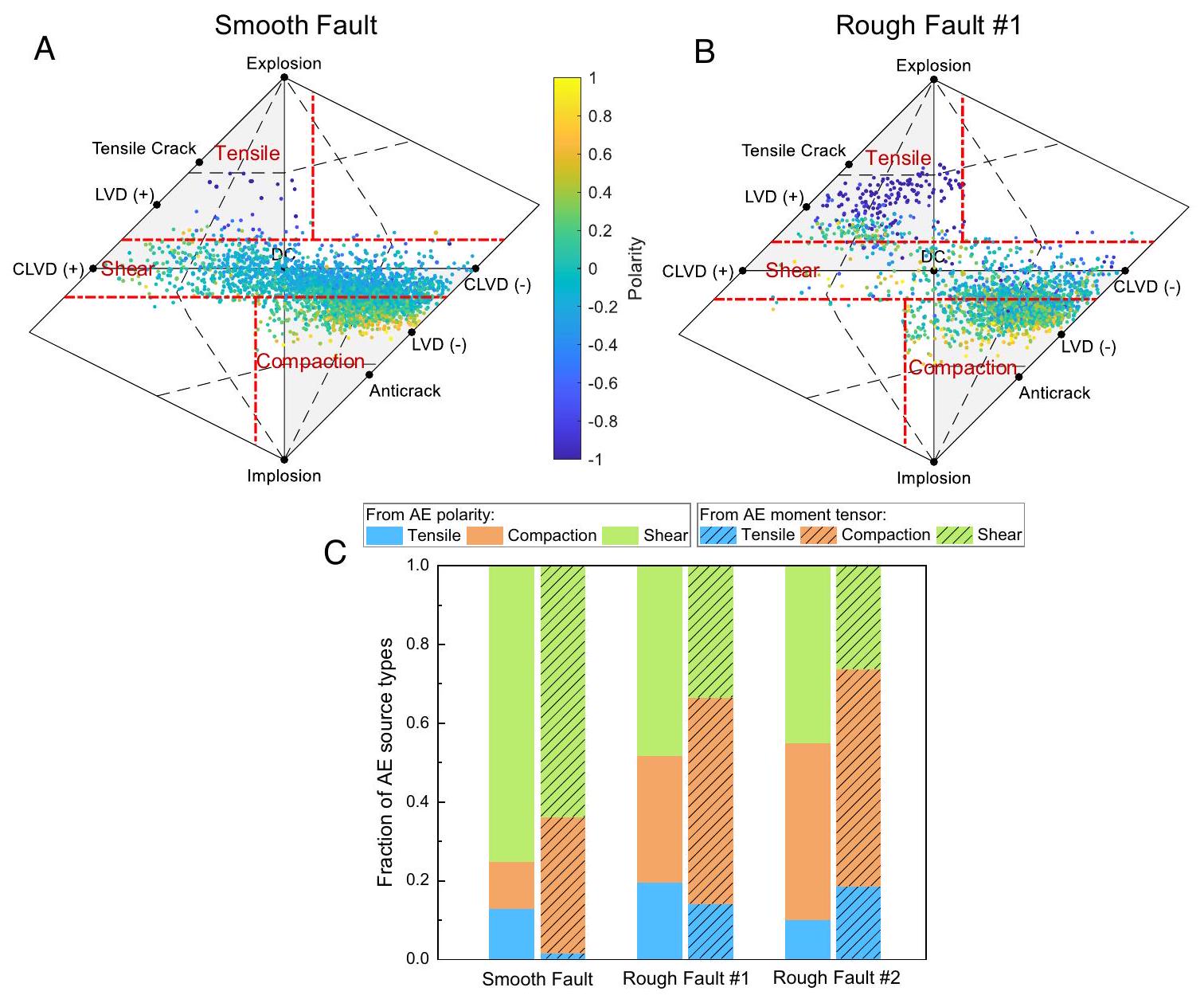 kinematics of AEs, with an increased fraction of non-double-couple components of AE moment tensors for the rougher faults. Natural earthquakes with non-double-couple mechanisms are commonly attributed to fault complexity (72). For nonplanar faults, the abundant development of intersecting fracture networks and potential damage-related changes of elastic properties in the source region may modify local stress fields and cause the slip vector to deviate from the principal fault surface (7, 24, 59). For the rough faults, we find that injection-induced AE activity localizes in the vicinity of high-stress asperities where substantial seismic moment is released, accompanied by low