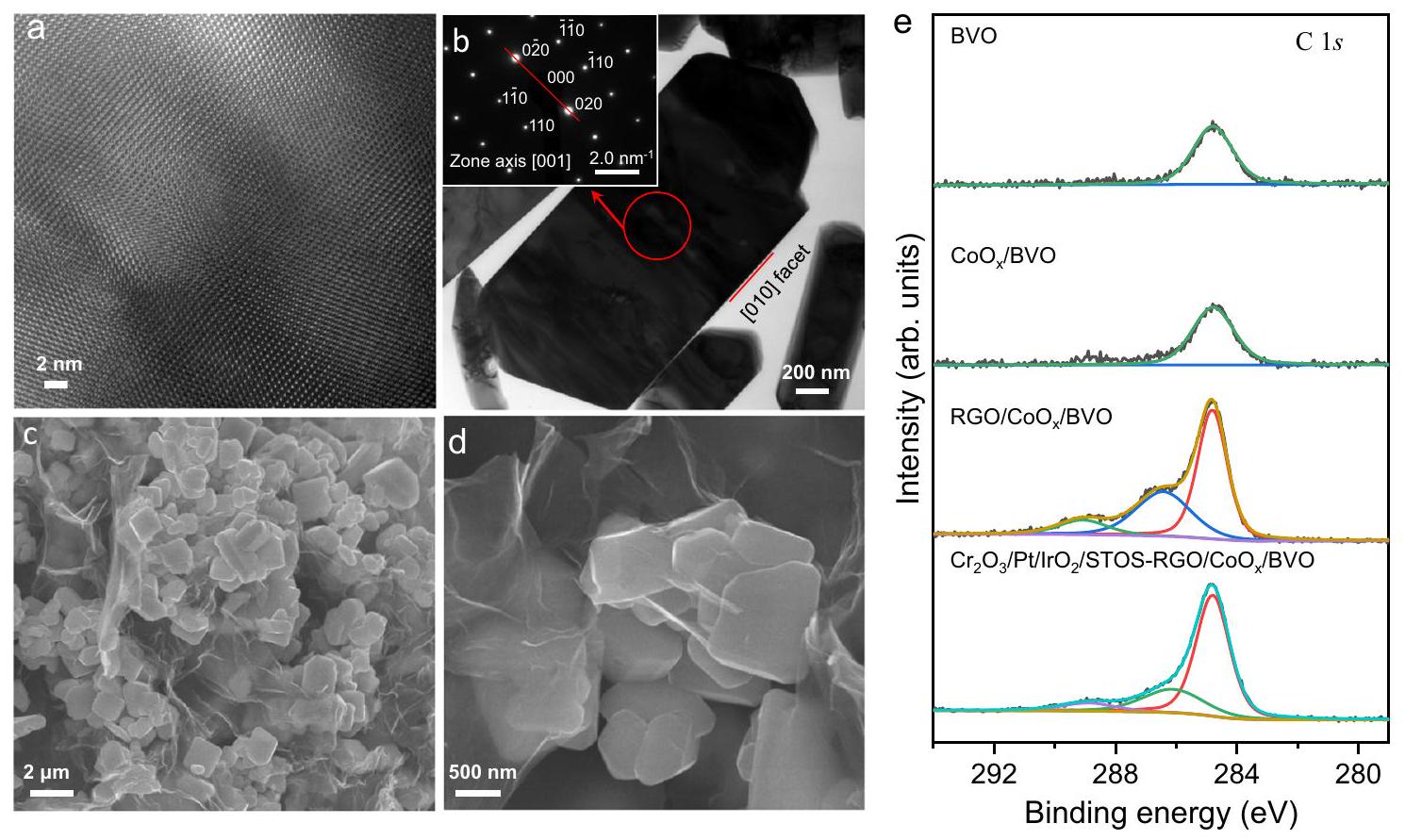 An XRD pattern obtained from the BVO is presented in Supplementary Fig. 1b and is in agreement with data previously reported in the literature . This material was confirmed to be highly crystalline by analyses using HR-TEM and SAED (Fig. 2a, b). After the photodeposition of on the BVO, a weak Co XPS signal was detected along with Bi, V and O peaks (Supplementary Fig. 10) . Following photoreduction of GO on the BVO surfaces, wrinkled RGO sheets were observed by both SEM and TEM (Fig. 2c, d and Supplementary Fig. 11). The XPS spectrum acquired from the resulting RGO/ BVO exhibited peaks centered at and 289.1 eV attributable to the and bonds of the RGO, respectively (Fig. 2e) .