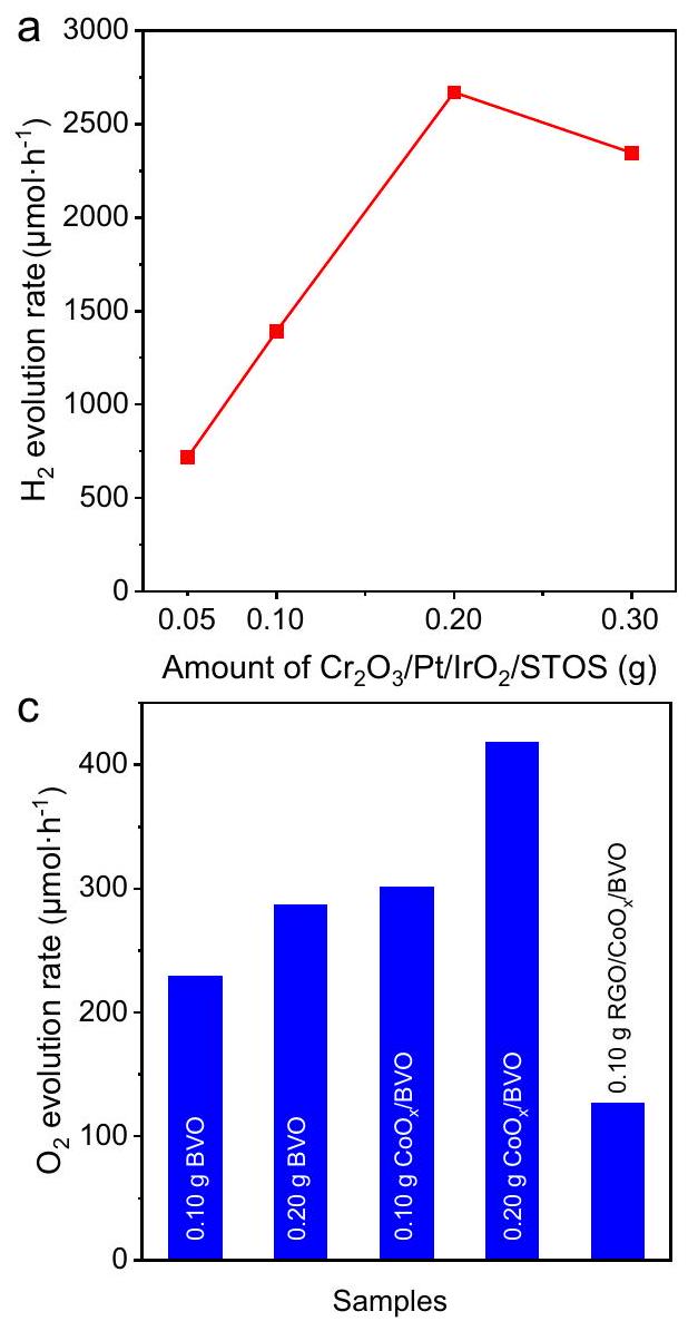 Photocatalytic hydrogen and oxygen evolution half-reactions were carried out to assess the performance of the HEP and OEP. In these trials, almost no was evolved from an aqueous methanol solution using bare STOS, or due to the lack of active sites. evolution was observed when employing the loaded STOS photocatalyst, and was dramatically enhanced by an additional modification with (Supplementary Fig. 12a). The optimal loading amount of , and were found to be 0.5 wt and , respectively (Supplementary Fig. 12b-d). The evolution rate for was also found to increase with increasing mass of photocatalyst used, reaching a maximum of during the first hour of the process in the case that 0.2 g of the photocatalyst was used in conjunction with the present reaction conditions (Fig. 3a). Further increasing the concentration of the photocatalyst powder will block the incident light due to the scattering at the top part of the suspension, which would lower the number of photons absorbed by the photocatalyst and therefore decrease evolution performance when the amount of photocatalyst was more than 0.2 g . A plot of AQY as a function of the irradiation wavelength closely matched the light absorption profile for STOS (Fig. 3b). The AQY value at 420 nm was and so was 36 times that