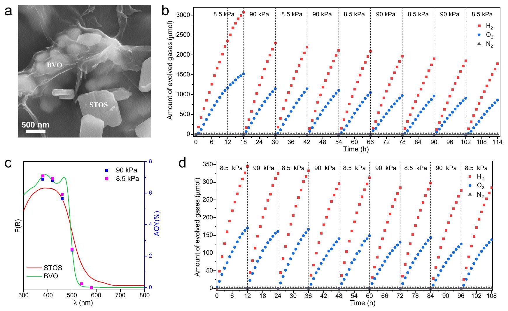 8.5 and 90 kPa Ar at different wavelengths together with the DRS data for the STOS and BVO. d The evolution of gases from the Z-scheme system over time at different Ar background pressures in response to irradiation with an AM1.5 G solar simulator.