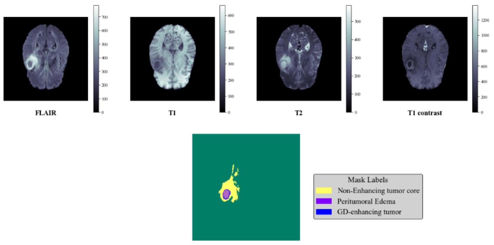 في هذا البحث، نقيم فعالية طريقة استخراج الميزات والتقسيم المقترحة باستخدام مجموعة بيانات BraTS2020، التي تتكون من 368 مسحة رنين مغناطيسي للدماغ مع تسميات، كل منها بحجم مع 155 شريحة، واستخدام واحدة من أربع أوضاع تصوير، وهي T1 وT1C وT2 وFLAIR، كما هو موضح في الشكل 4. تم إجراء التجربة على جهاز مزود بمعالج i7-6500U يعمل بسرعة من ذاكرة الوصول العشوائي، وNVIDIA GEFORCE GTX. توفر كل وضع تصوير معلومات فريدة لتحديد أورام الدماغ، مثل أنه يمكن تحديد الأنسجة السليمة في صور T1، ويمكن تحديد حدود الورم باستخدام وضع T1C، ويمكن تمييز مناطق الوذمة من السائل الدماغي الشوكي في صور FLAIR، وتكون صور T2 مفيدة لتحديد مناطق ورم الوذمة. جميع أوضاع التصوير مدرجة في طريقتنا المقترحة ومعالجة مسبقًا قبل استخدامها كصور إدخال للشبكات العصبية.