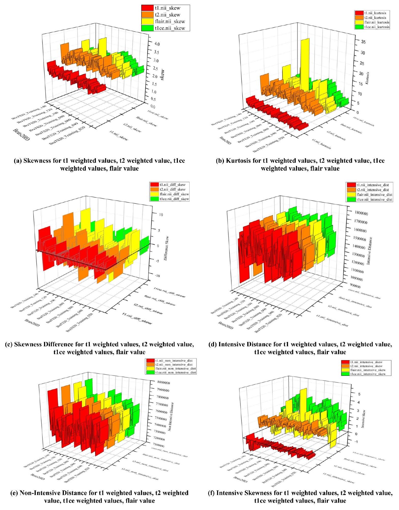 Figure 12d shows the experimental result of intensive distribution for the BRATS 2020 dataset with t1 weighted, t1ce weighted, t2 weighted and flair.