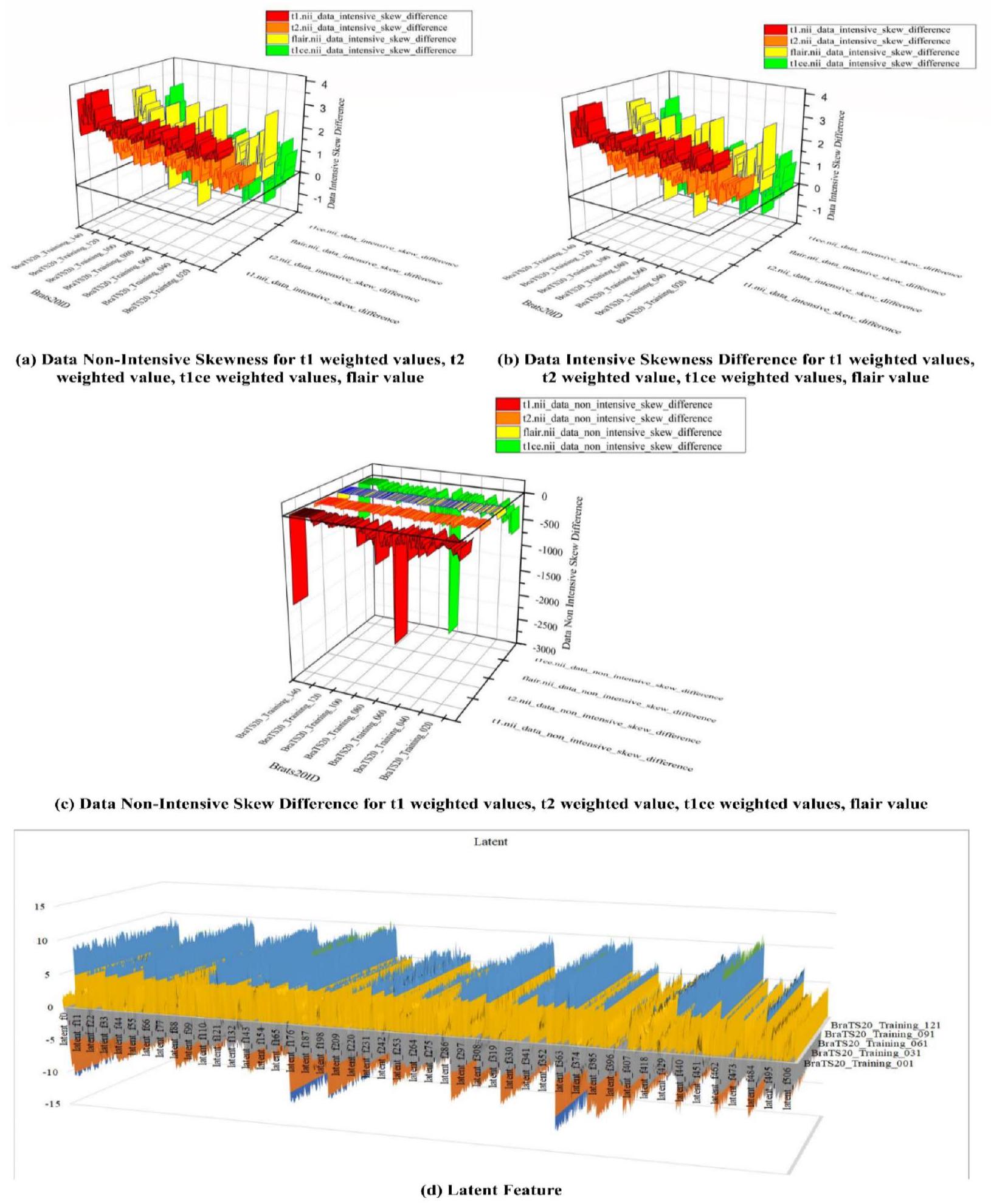Data non-intensive skewness difference It is the difference between data skewness and non-intensive skewness. Figure 13c shows the experimental result of data non-intensive skewness Difference for the BRATS 2020 data set with t 1 weighted, t 1 ce weighted, t 2 weighted and flair.