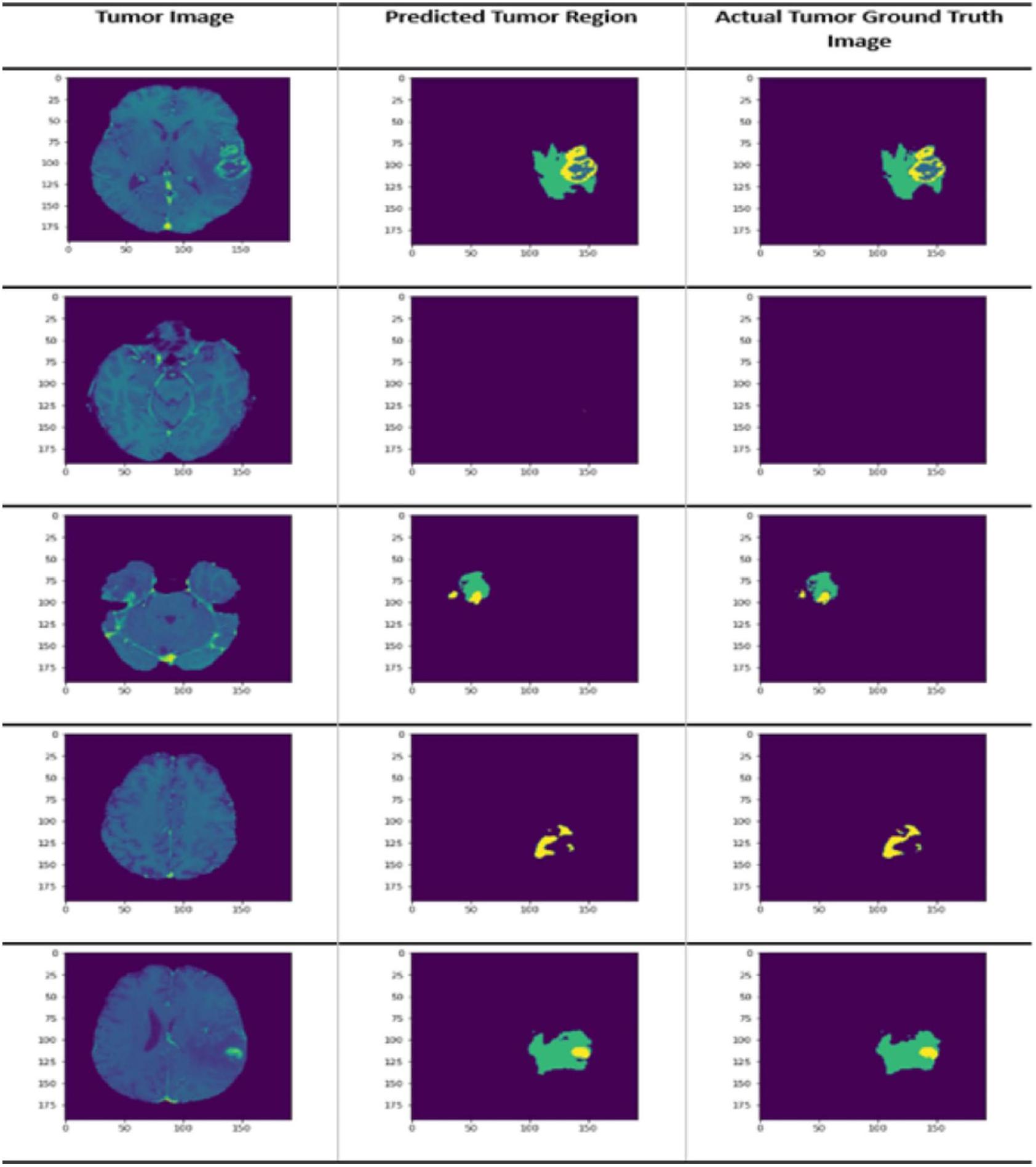 Fig. 15. The model’s prediction after dividing the image into segments can be represented in three forms: (a) the original tumor image, (b) the tumor region predicted by the model, and (c) the real tumor region as shown in the ground truth images.