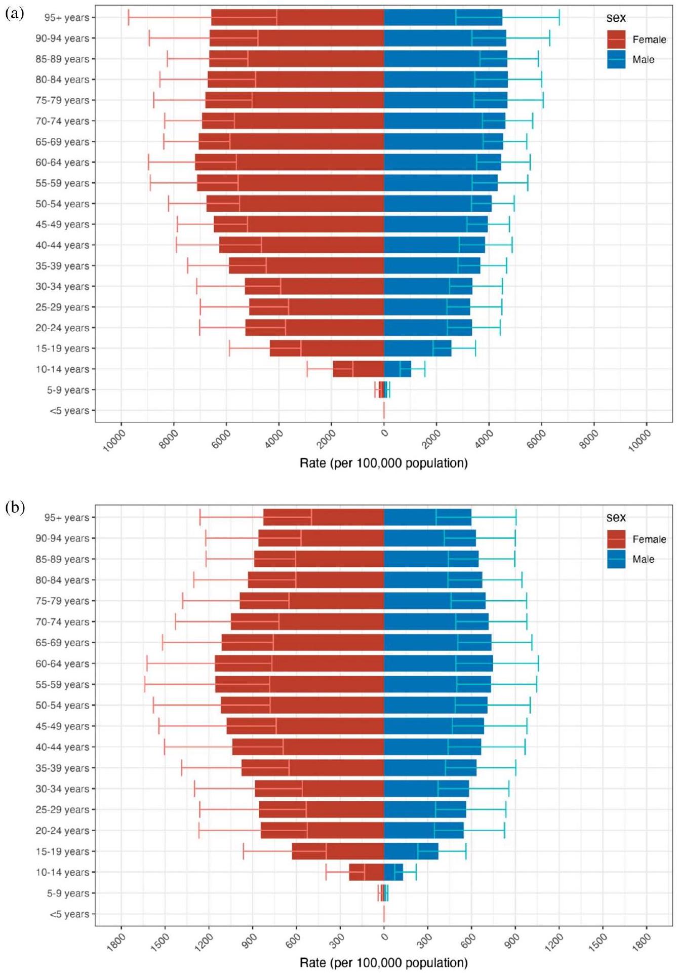 UI 492.3-963.58)، على التوالي (انظر الشكل 2، الجدول 1). بشكل عام، تطور الإناث معدل الإصابة القياسي والعمر القياسي أكبر من الذكور في نفس الفئة العمرية. ومع ذلك، خلال الفترة من 1990 إلى 2019، كان التغير في سنوات الحياة المعدلة بالعجز أعلى لدى الذكور مقارنة بالإناث،