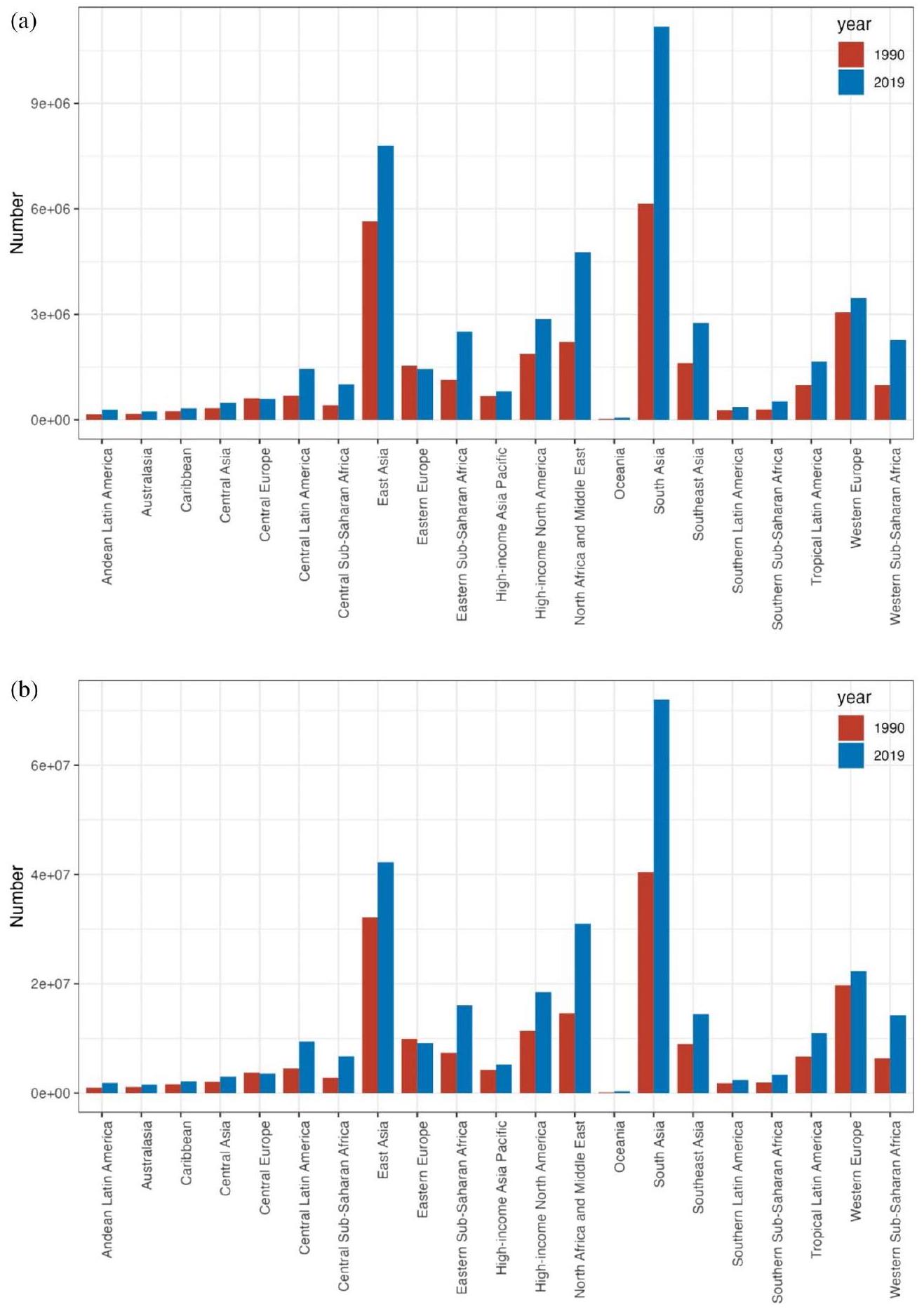 ) على التوالي في عام 2019. وكان نفس الشيء صحيحًا بالنسبة لسنوات الحياة المعدلة حسب الإعاقة (DALYs)، التي كانت