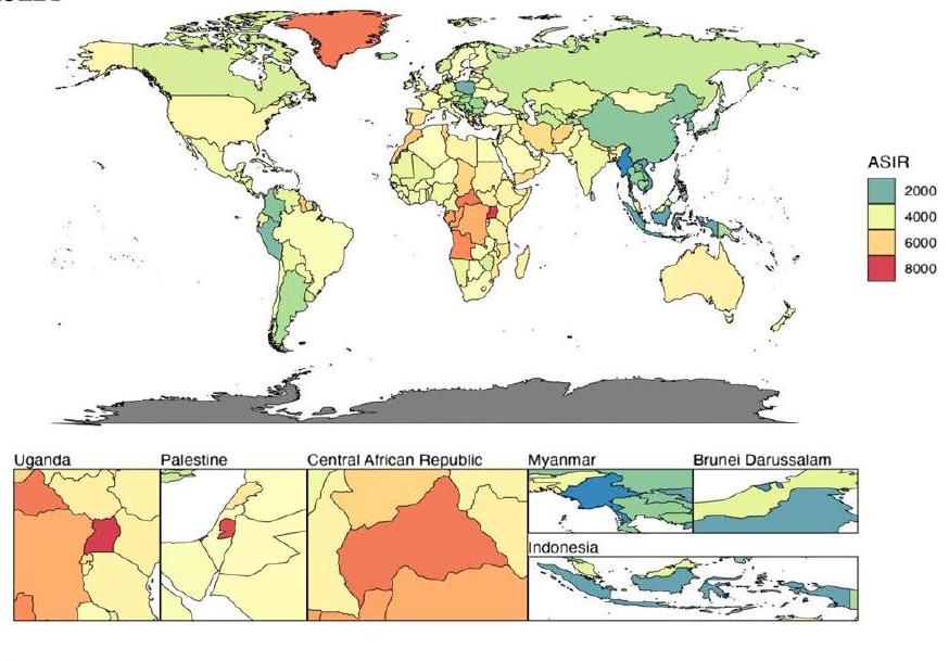The ASIR and ASDR increased the most in Spain, followed by Mexico and Malaysia. These countries are reported to have higher economic incomes and sociodemographic indices, which confirm our statistics. However, in terms of ASR, the greatest decline in ASIR was in Singapore, then Sri Lanka and Slovenia; and the maximum decline in ASDR was in Singapore, Cuba, and Estonia