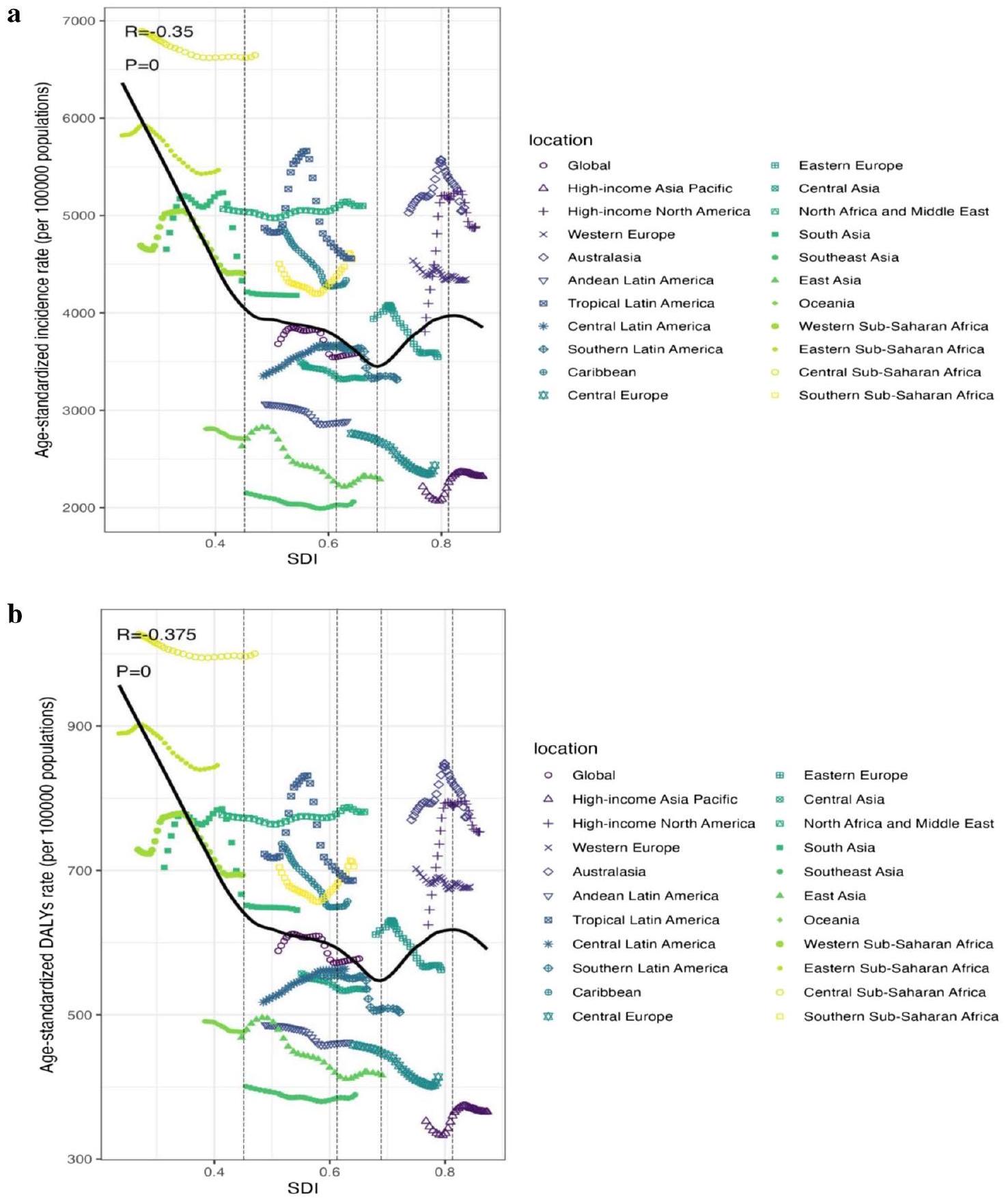 DALYs declined in many areas as the SDI became higher, with the exception of certain regions. For instance, the DALYs rate in Western Sub-Saharan Africa fell briefly, then rose, and then kept falling, forming an inverted U-curve. The DALYs rate of Tropical Latin America, which has a low-middle SDI rank, remained stable at first, then increased, before declining sharply. The rate of Southern Latin America, which has a middle SDI rank, remained stable at first, then decreased, and then continued to remain stable. The DALYs rate of Eastern Europe, which has a high-middle SDI, rose slightly, then fell sharply, remained stable for a period, and then fell slightly. High SDI ratios in high-income Asia-Pacific regions fell briefly and then rose, before falling slightly (see Fig. 5b).