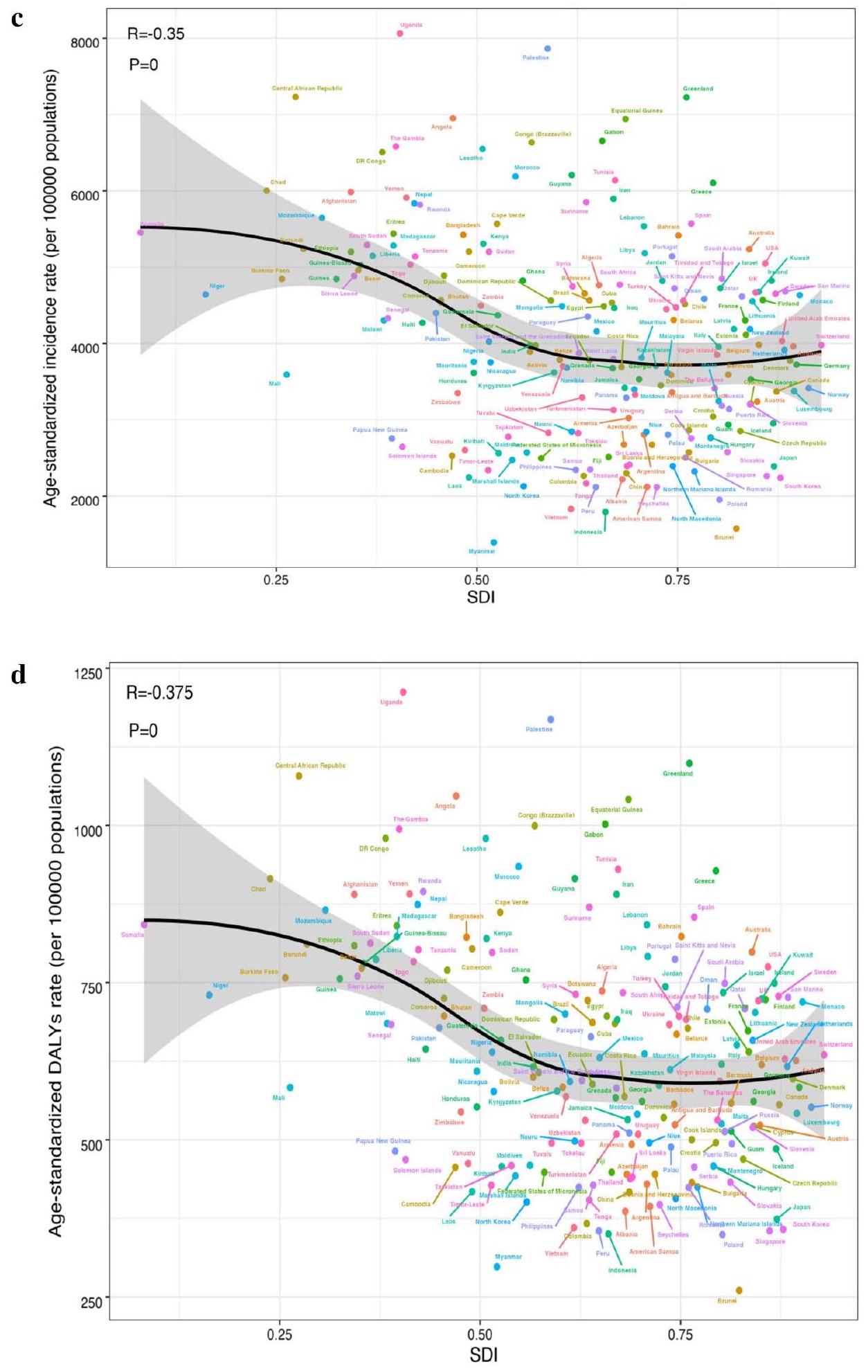 Since 1990 to 2019, the DALY rates obtained in high SDI-ranking regions, such as Western Europe, were mostly consistent with expectations. However, during the study period, some regions (e.g., high-income Asia-Pacific) continued to have DALYs far lower than expected, while others (e.g., Australasia and high-income North America) continued to have DALYs higher than expected (see Fig. 5b). At the country level during 2019, following a similar pattern to the association of morbidity and SDI, there was a marked adverse correlation between DALYs and SDI, with a few exceptions (