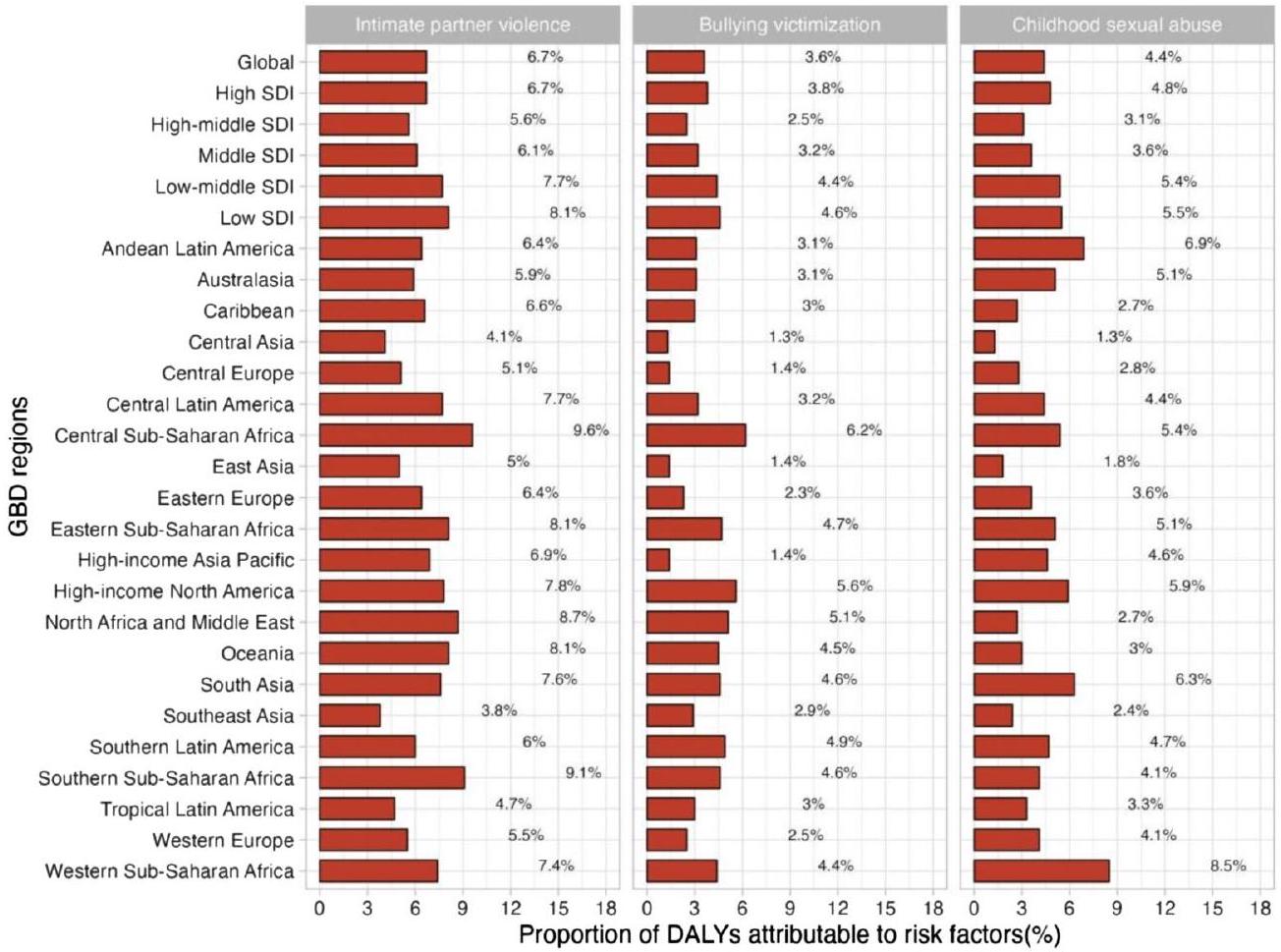 Figure 7. Proportion of depressive disorders DALYs attributable to intimate partner violence, bullying victimization, and childhood sexual abuse, for 21 GBD regions, 2019.