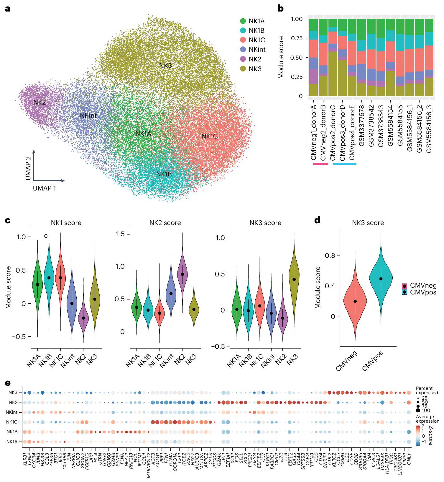 الجدول 2). أظهر تحليل أكثر تفصيلاً على مستوى الفئات الفرعية (الشكل 2ب والشكل الممتد 3ف) أن ما يقرب من نصف مجموعة NK1 تتكون من خلايا NK1C، مما يترجم إلى من جميع خلايا NK المتداولة. مثلت مجموعة NK2 جزءًا صغيرًا من إجمالي خلايا NK ( ) مقارنةً بـ NKint ( من إجمالي خلايا NK). أظهر تجمع NK3، الذي يتميز بالتعبير المميز عن علامات تشير إلى كل من خلايا NK الناضجة بشكل نهائي والخلايا التكيفية (مثل PRDM1 و B3GAT1 (الذي يشفر إنزيمًا رئيسيًا في تخليق CD57)) جنبًا إلى جنب مع الجينات المرتبطة بشكل فريد بخلايا NK التكيفية (CD3E و ZBTB38) (الشكل 1ج، د)، تباينًا كبيرًا في انتشاره عبر الأفراد (الشكل 2ب). تم إجراء نهج دراستنا لتحديد التجمعات دون النظر في حالة HCMV. وبالتالي، للتعرف على التأثير المحتمل لـ HCMV على تجمع NK3، أجرينا تحليلات منفصلة لتكرار ونقاط التنبؤ لخلايا NK3 في الأفراد الإيجابيين لـ وفي أولئك الذين ليس لديهم . من الجدير بالذكر أن خلايا تجمع NK3 لوحظت في كل من المتبرعين بـ و (الشكل 2ب والشكل الممتد 3ف). ومع ذلك، لوحظت درجة NK3 أعلى بشكل أساسي في خلايا NK3 المشتقة من الأفراد بـ (الشكل 2د). بشكل عام، توفر هذه الرؤى منظورًا كميًا حول توزيع وتباين مجموعات خلايا NK في مجرى الدم.