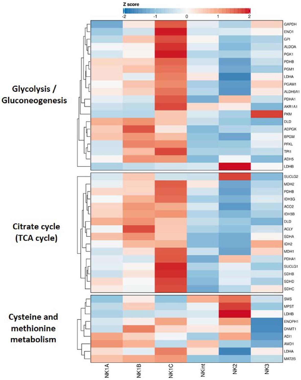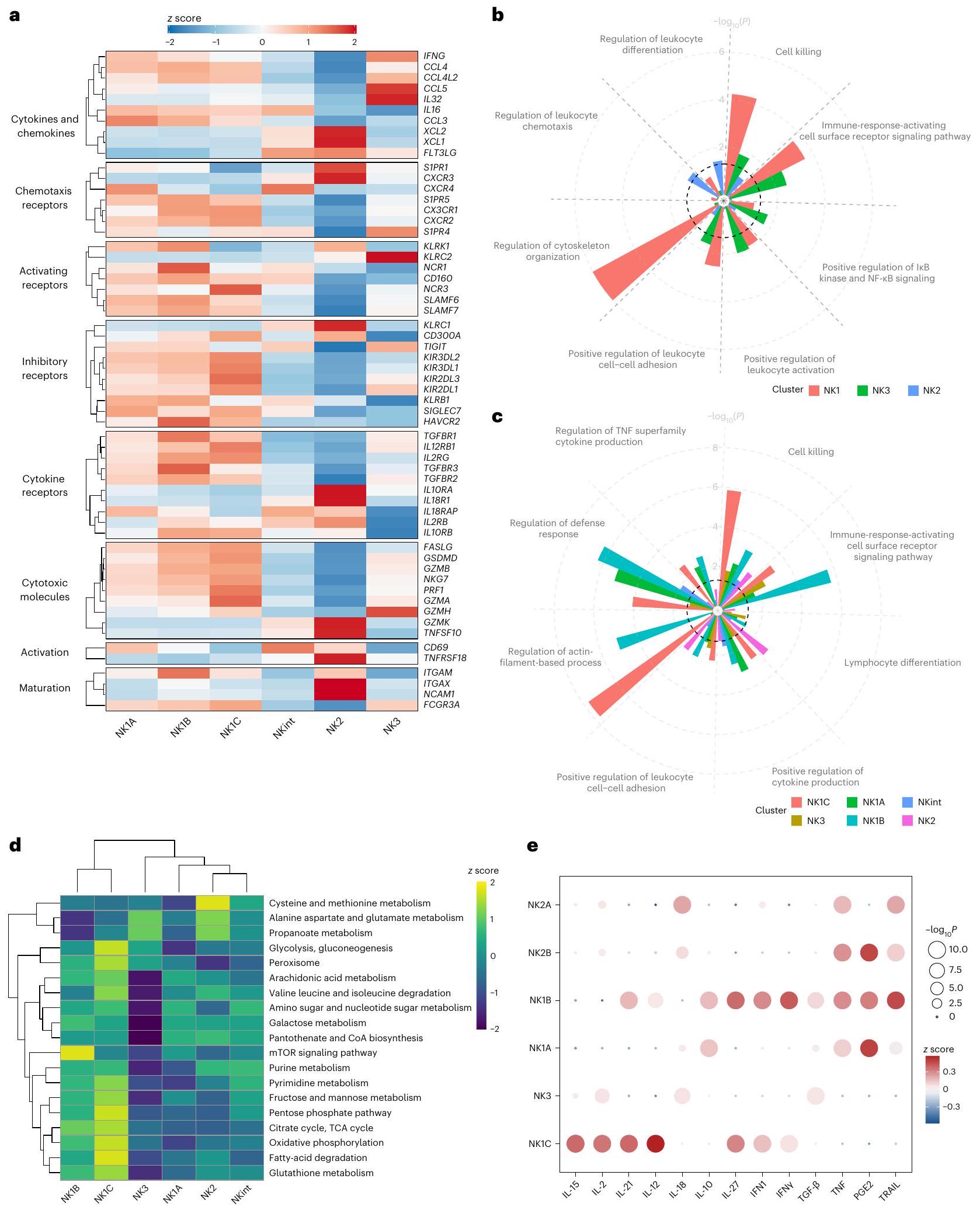 فصل تحليل التجميع بناءً على تحليل إثراء مسار الأيض الفئات الفرعية لخلايا NK إلى فئتين عريضتين، حيث كانت NK1B وNK1C تتجمعان بشكل أقرب معًا وبشكل منفصل عن الفئات الفرعية NK1A وNK2 وNK3 وNKint (الشكل 3د). يبدو أن مجموعة NK1C ‘هايبر ميتابوليك’، مع زيادة ملحوظة عبر الأيض الكربوني المركزي، بما في ذلك التحلل السكري ودورة TCA، والفوسفوريلاكس الأكسيدية الميتوكوندرية (OXPHOS)، مما قد يدعم النشاط السمي المعزز. وبالمثل، تظهر مجموعة NK1B أيضًا زيادة في دورة TCA وOXPHOS، وإن كان إلى حد أقل من NK1C، على عكس الفئات الفرعية الأخرى لخلايا NK. بالإضافة إلى ذلك، يتم تعريف خلايا NK1B بشكل أوضح من خلال زيادة في مسار إشارة mTOR. أخيرًا، يتم إثراء أيض السيستين والميثيونين في مجموعة NK2. وجدت تحليل التفكيك لهذا المسار (الشكل الممتد 5أ) أن التوقيع كان مدفوعًا جزئيًا بمستويات عالية من إنزيم اللاكتات ديهيدروجيناز B (LDHB) وسميرين سينثاز (SMS) و3-ميركابتوبيروفات سلفورترانسفيراز (MPST). يبدو أن LDHB (الذي يحول بشكل تفضيلي اللاكتات إلى البيروفات وNAD إلى NADH) هو الشكل المهيمن من اللاكتات ديهيدروجيناز في مجموعة NK2؛ بينما يتم التعبير عن LDHA (الذي يحول بشكل تفضيلي البيروفات إلى اللاكتات وNADH إلى NAD ) بشكل مرتفع عبر الفئات الفرعية الأخرى لخلايا NK. تشير هذه البيانات إلى أن ملفات الأيض المختلفة تكمن وراء الفئات الفرعية لخلايا NK وتستدعي مزيدًا من التحقيق.