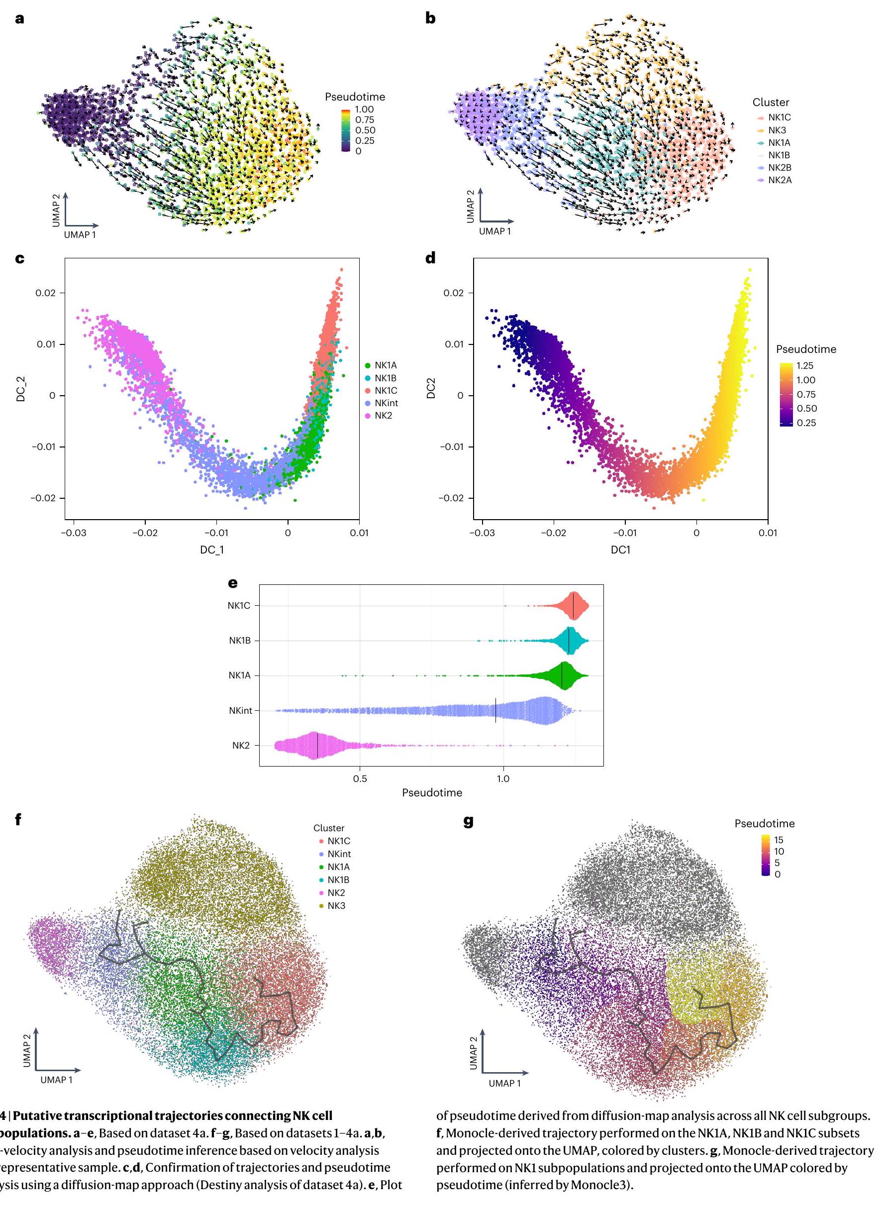 أولاً، تم استخدام سرعة RNA للتنبؤ بالحالات المستقبلية للخلايا الفردية. أشار هذا التحليل إلى أن الغالبية العظمى من خلايا NK2 من المحتمل أن تستمر كخلايا NK2، مكونة مسار NK2 محدد (الشكل 4a،b). ومع ذلك، أشار أيضًا إلى مسار تمايز محتمل من NKint إلى NK1C. كان هذا المسار يتميز بتقدم زائف واضح من NKint إلى NK1C، مع الانتقال عبر تجمعات وسيطة (NK1A و NK1B) (الشكل 4a،b). خلايا NK3، التي تظهر ديناميات نسخ شبيهة بالتكاثر بسبب تفاعلها معتم استبعادها من تحليل المسار التالي، لتجنب تأثير سلوكها النسخي الفريد على النتائج. تم استخدام تحليل المسار الإضافي باستخدام خرائط الانتشار (Destiny ) واستنتاج المسار (Monocle3 (المرجع 20)) أكد المسار الذي اقترحته تحليل سرعة RNA (الشكل 4c-g). استنتاج الزمن الزائف أوضح بوضوح مسارًا من NKint إلى NK1C (الشكل 4d,e,g). ومن الجدير بالذكر أن الزمن الزائف المستنتج من خلال تحليل خريطة الانتشار أظهر فجوة كبيرة بين NK2 و NKint (الشكل 4e)، مما يعزز مفهوم وجود مسارين متميزين: أحدهما حيث تبقى خلايا NK2 في الغالب NK2، والآخر يؤدي من NKint إلى NK1C. يتماشى هذا المسار الأخير مع التجميع غير المراقب القائم على الأيض الذي تم مناقشته سابقًا (الشكل 3d)، والذي جمع بين NK1B و NK1C بشكل وثيق بسبب نشاطهما القوي في أيض الكربون المركزي. بالمقابل، تجمعت NKint و NK1A معًا وأظهرت نشاطًا أيضيًا أقل.