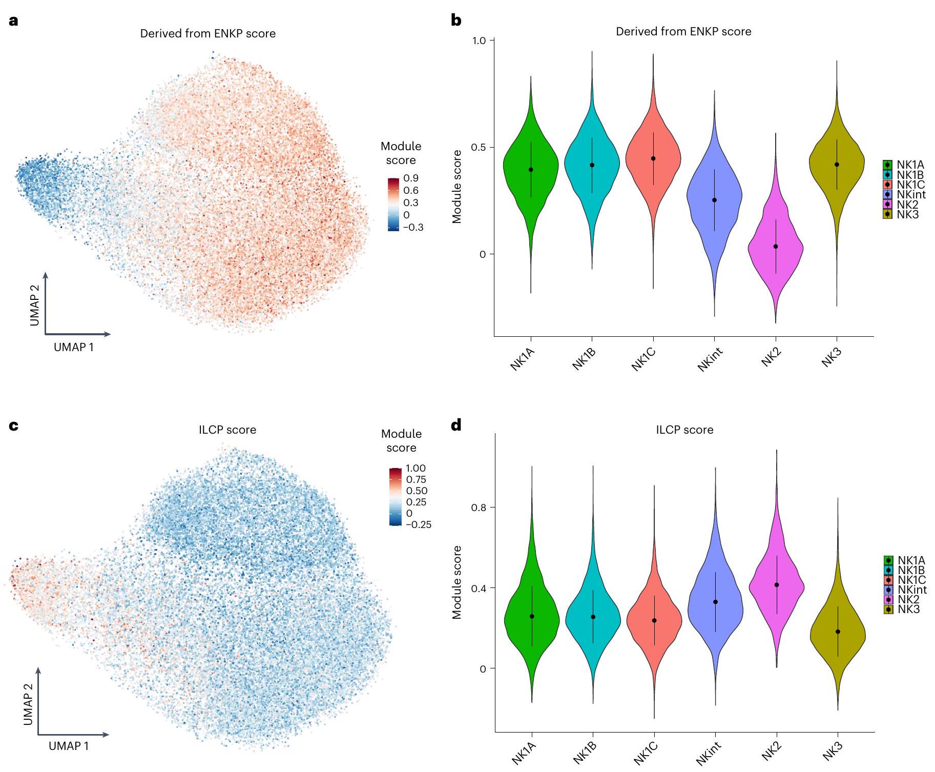 تحليل سرعة RNA يتنبأ أيضًا بمسار تطوري رئيسي آخر، مما يشير إلى أن جزءًا كبيرًا من خلايا NK2 من المحتمل أن تحافظ على حالة خلايا NK2. ويدعم هذا الاحتمال أدلة تشير إلى أن تجمعات خلايا NK في الفئران تنشأ من سلالتين متميزتين: سلف أولي، يُعرف باسم سلف خلايا NK المبكرة (ENKP)، وسلف بديل، يُسمى السلف الشائع للخلايا اللمفاوية الفطرية (ILCP)، الذي يمكنه أيضًا أن يعطي نشأة لأنواع أخرى من خلايا ILC.من خلال رسم درجات وحدات النسخ لخلايا الدم البشرية ENKPs على تمثيل تقريبي موحد وProjection (UMAP)، لاحظنا أن كل من مجموعات NK1 وNK3 أظهرت توقيعات نسخية تتماشى بشكل وثيق مع تلك الخاصة بخلايا NK التي تنشأ من ENKPs (الشكل 5a، b). بالإضافة إلى ذلك، تم تقييم درجات مجموعات NK1 وNK2 وNK3 بناءً على توقيعات ILCP البشرية المتاحة حديثًا في الدم.كشفت أن توقيعهم غني بـ NK2s (الشكل 5c، d). تدعم هذه الملاحظات مجتمعة وجود مسارين تطوريين متباينين: أحدهما لـ NK1 و NK3، ينشأ من ENKPs، والآخر لـ NK2، ينشأ من ILCPs.